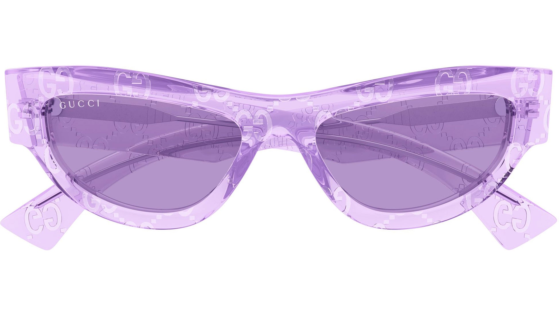 Gucci GG1834S 015 sunglasses for women, featuring shiny transparent violet w/ Gucci pattern cat eye recycled acetate frame and solid violet bio nylon lenses. Brand line: Name Of Brand. Style code: GG1834S. Color code: 015. Made in Italy. Authorized Gucci online reseller. Your glasses will include the original case and accessories and are covered by a 12-month global warranty.