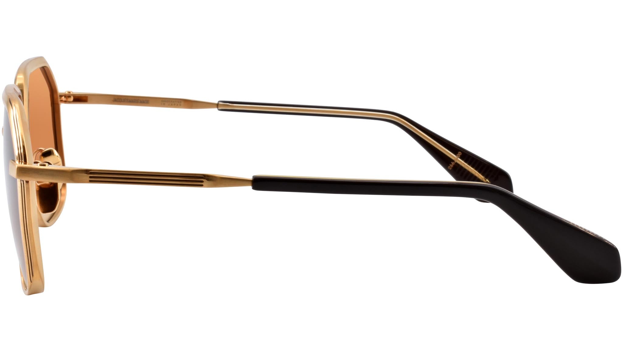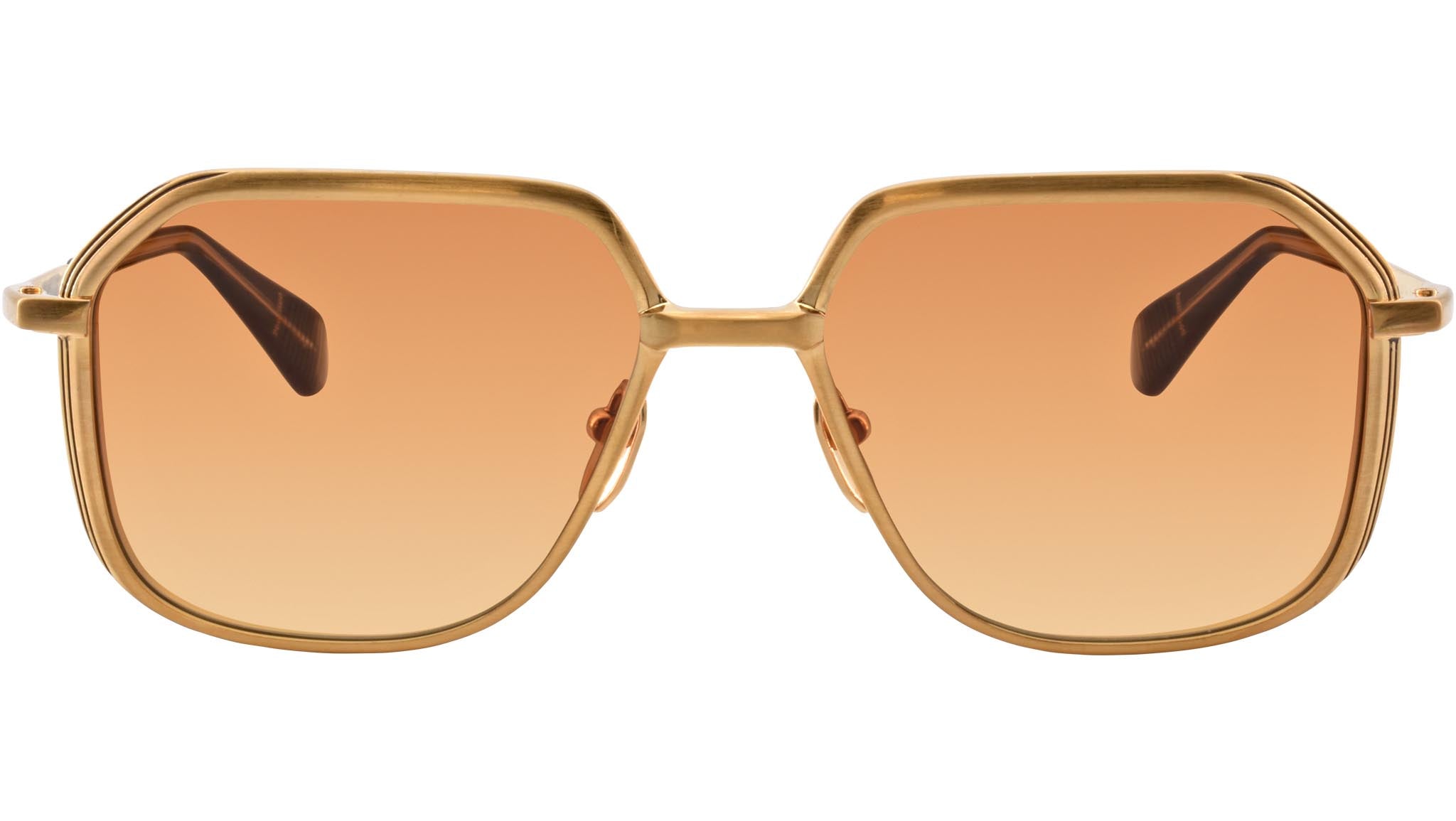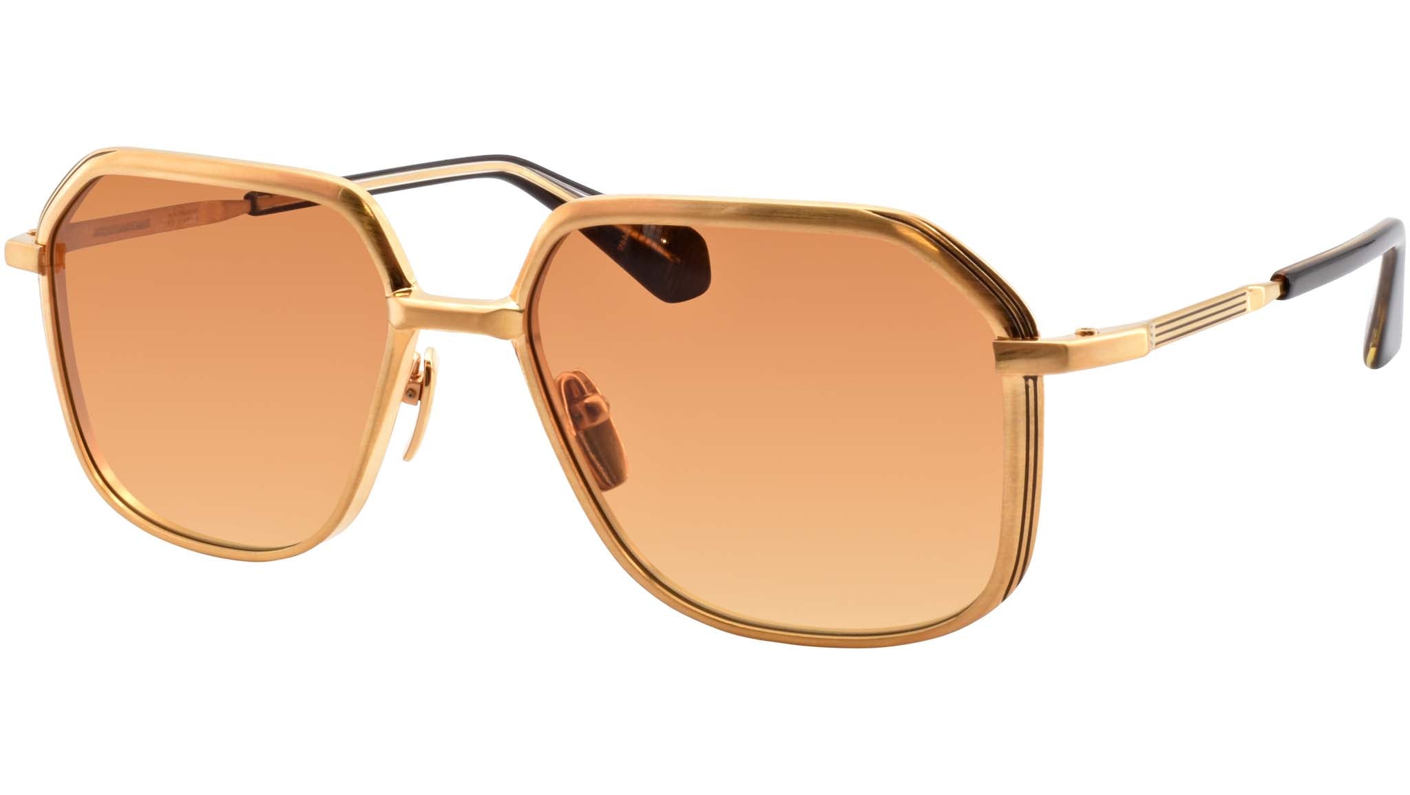 Softer, rectangular, late-‘70s-inspired glasses from the Titanium Series, featuring a new V-shaped profile, custom hidden hinge, and hairline epoxy details. Dark gold 100% beta titanium frame with brown cured cellulose acetate accents and brown gradient lenses. Custom dark gold hidden hinge. walnut acetate temple tips. Custom nose pads with logo and hairline engraving. Dark bronze gradient 4 base lens CR-39 lenses with backside anti-reflective treatment.