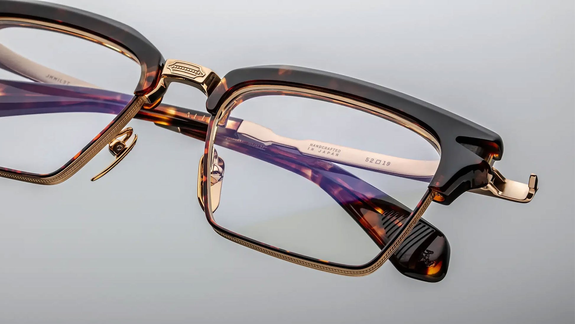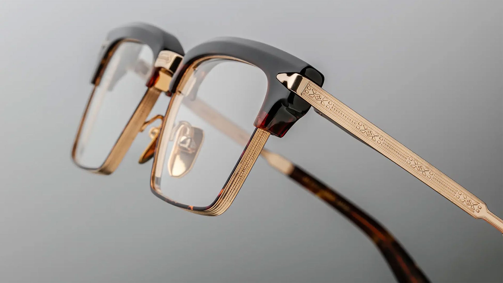 Light gold 100% beta titanium frame with light gold accents, Havana cured cellulose acetate, and demo lenses. Features light gold engraved titanium temples with acetate tips, a light gold tension-secured custom arrowhead monoblock hinge, and havana cellulose acetate custom nose pads with logo and hairline engraving.