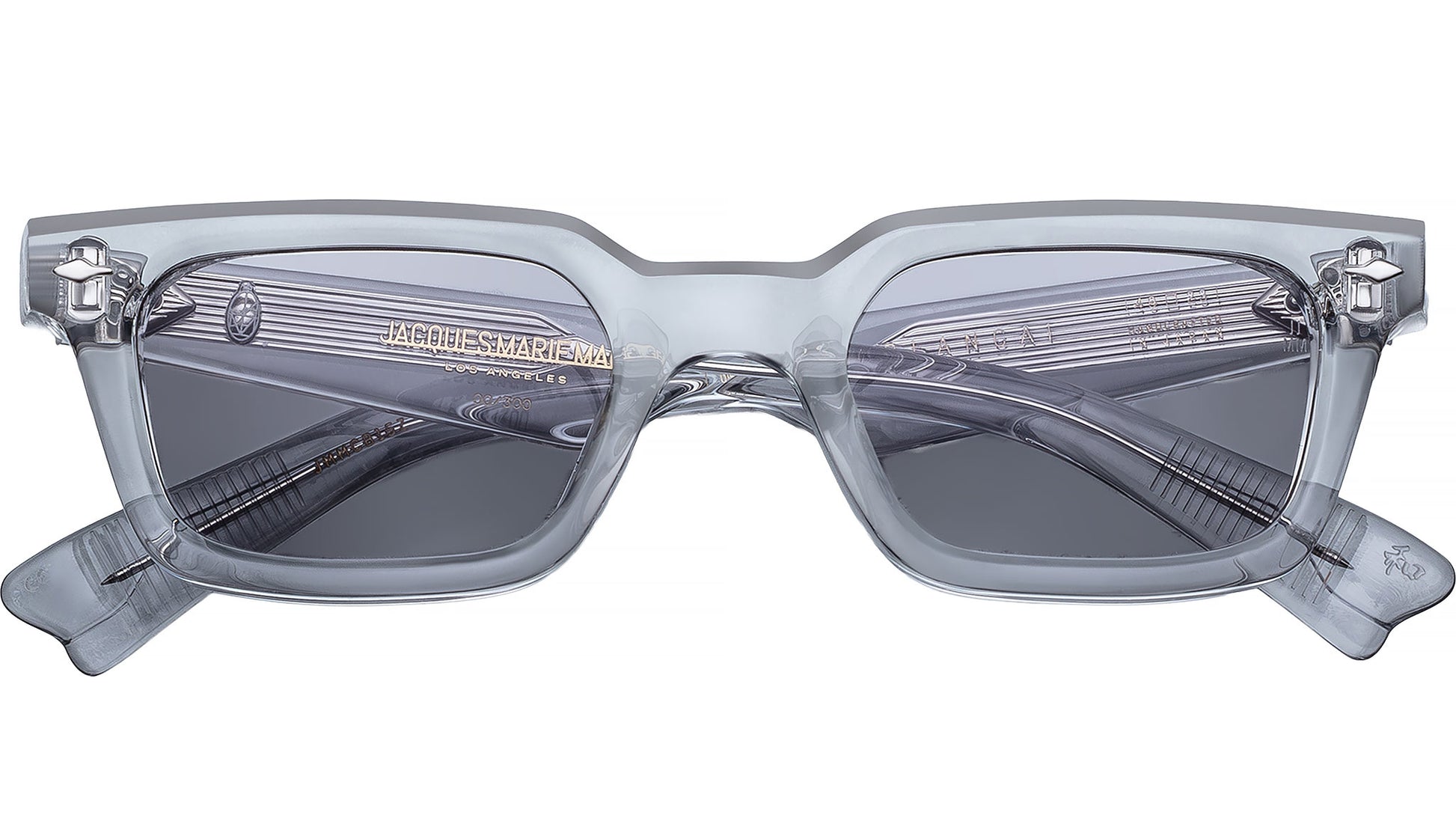 The Jacques Marie Mage Casablanca Sulfur sunglasses are compact and slender, showcasing a refined rectangular lens shape paired with a clever brow line and a delicate, minimalist bridge. The design is elevated by double-laminated temples and the brand's signature polished metal hardware, combining sharp proportions with sophisticated detailing for a look that is both subtle and striking.
