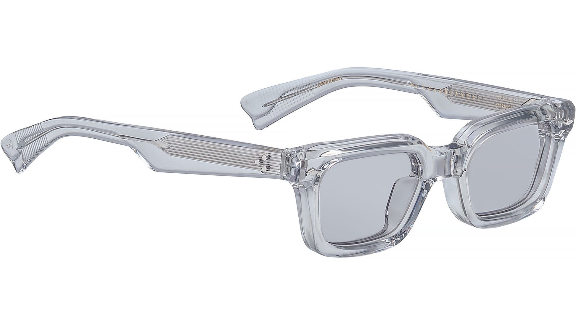 Crafted from 10mm grey cured cellulose acetate, this frame features custom acetate temples adorned with precious metal hardware and fitted with matching grey lenses. Sterling silver signature arrowhead front pins and exposed silver-finished 'Classic' wirecores emphasize the meticulous craftsmanship, while custom stainless steel 7-barrel hinges with Art Deco hairline detailing offer both strength and sophistication. The Dove Armorlite 4-base lenses include a backside anti-reflective treatment, ensuring enhanced visual clarity and comfort.