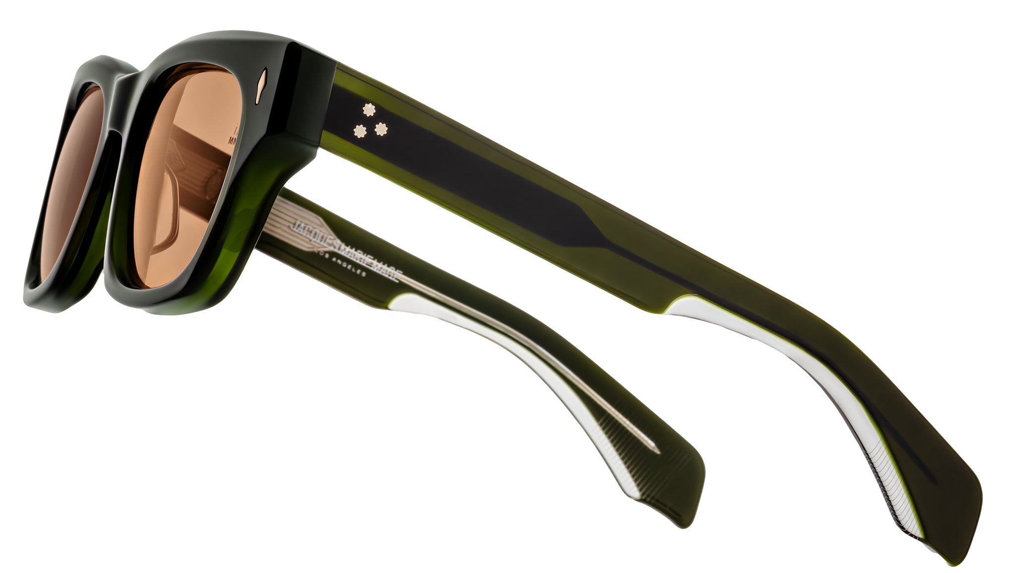 Green 10mm cured cellulose acetate frame with custom double-laminated acetate temples featuring precious metal hardware, silver signature arrowhead front pin, inner wirecore, tension-secured custom 7-barrel hinge, silver domed 3D metal cameo logo, orange CR-39 6-base lenses with backside anti-reflective treatment.