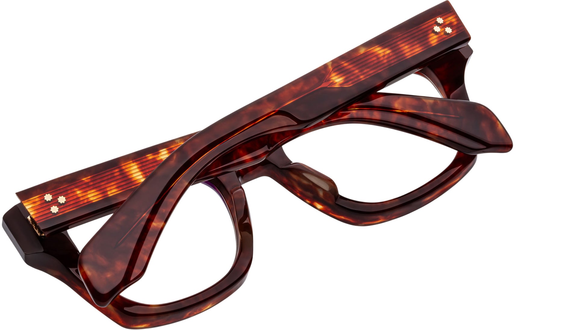 Havana 10mm cured cellulose acetate frame with custom double-laminated acetate temples featuring precious metal hardware and light brown lenses, light gold signature arrowhead front pin, hidden inner wirecore, tension-secured custom 7-barrel hinge, light gold domed 3D metal cameo logo, superlight brown CR-39 lenses.