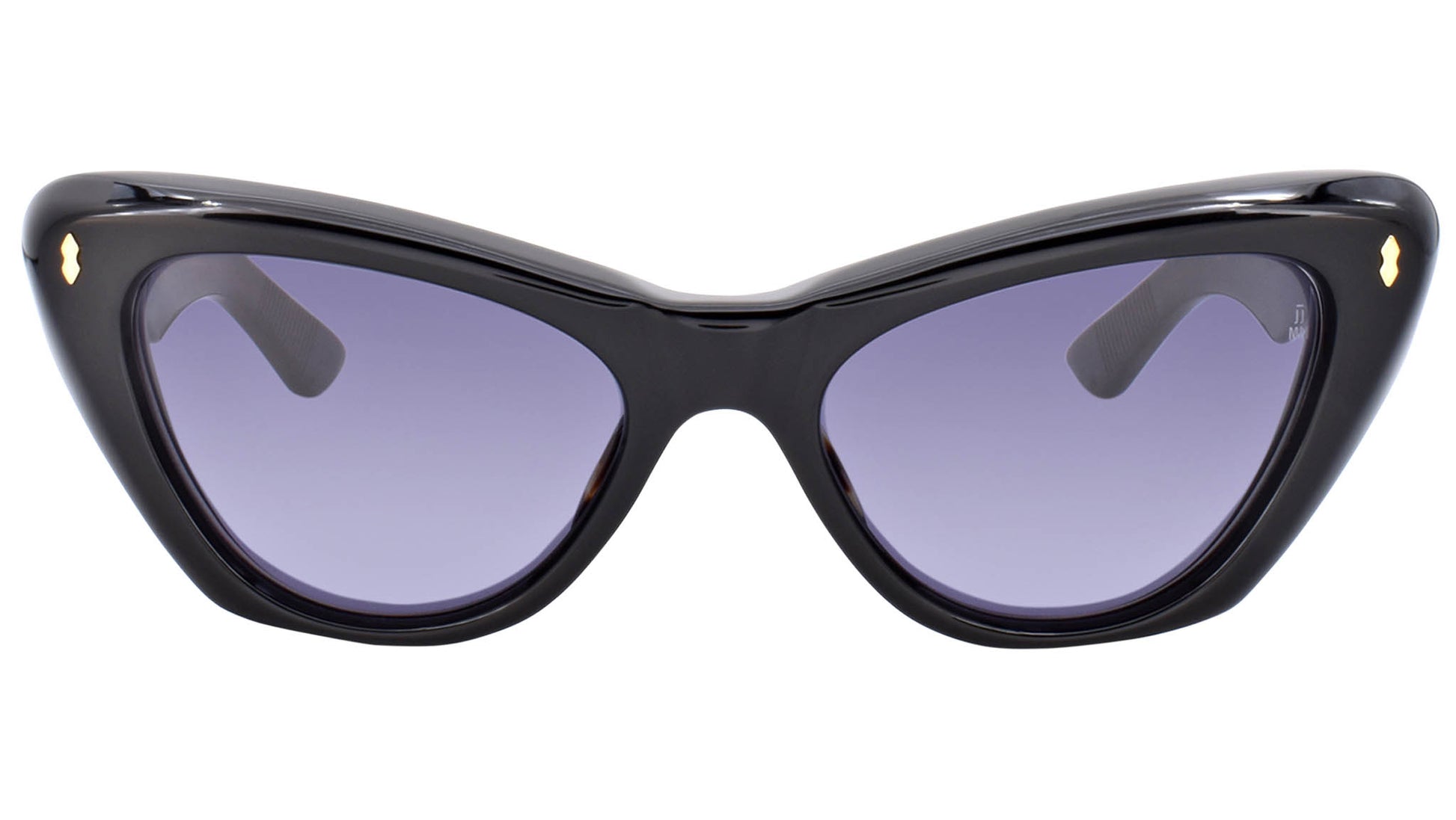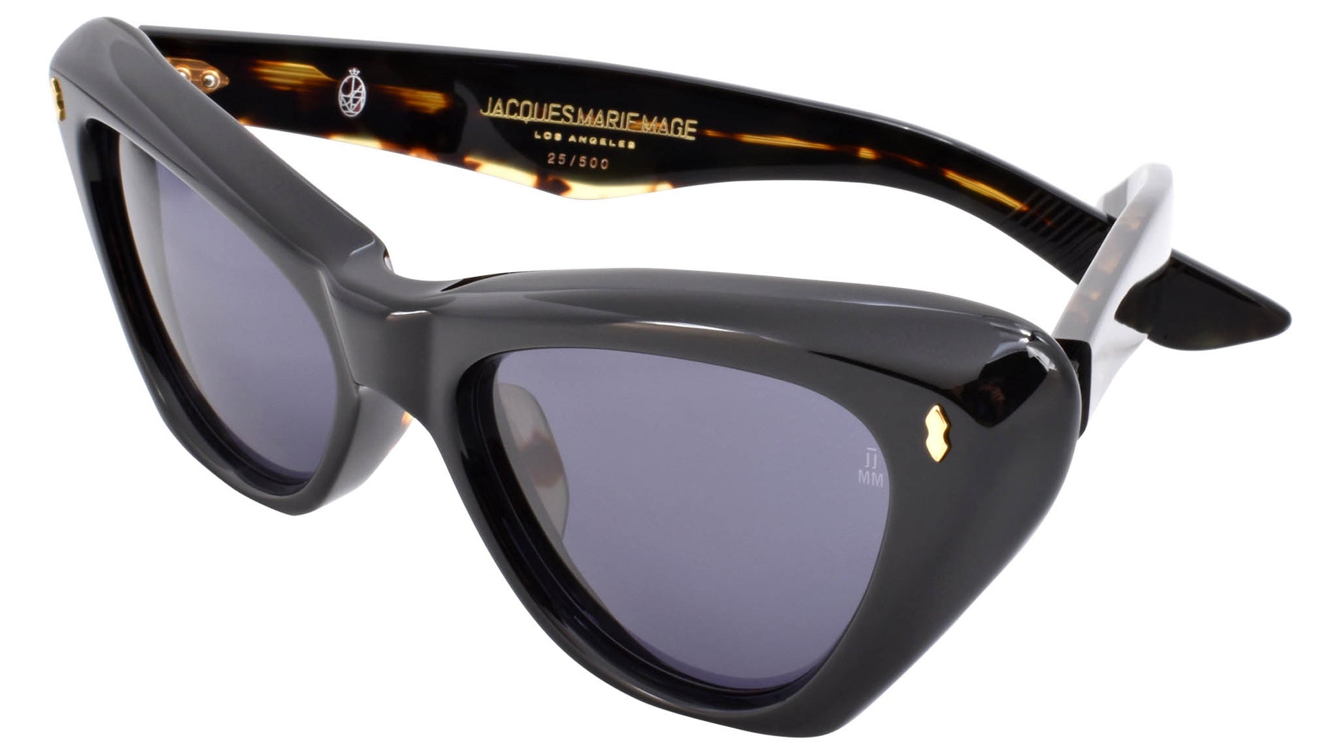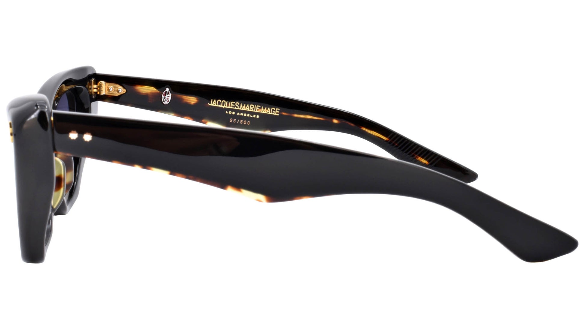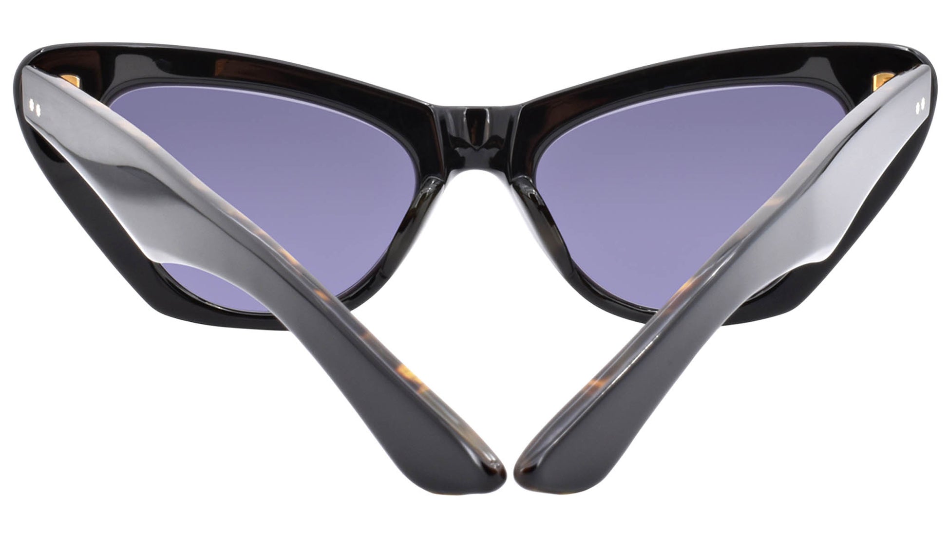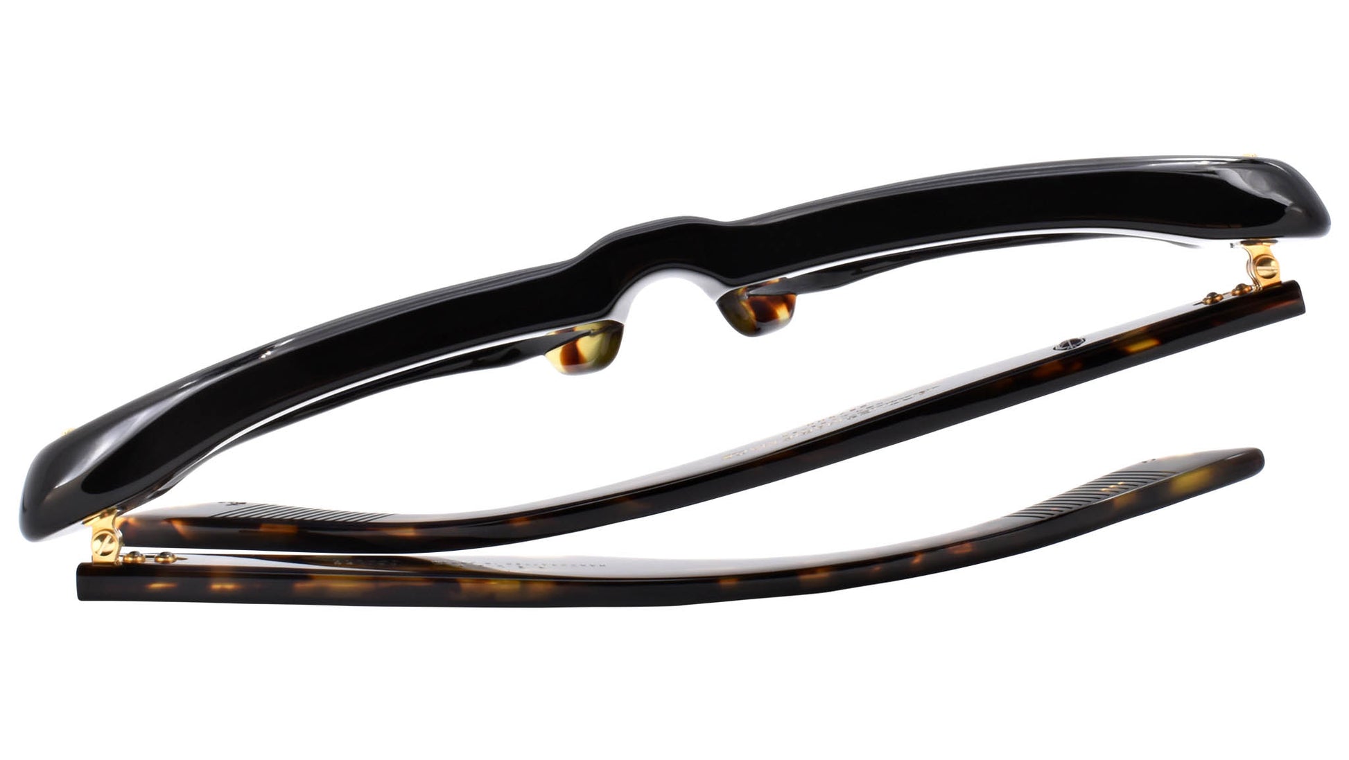 Material: 10mm polished black and tortoise cured cellulose acetate frame, custom double laminated acetate temples featuring precious metal. Hardware: dark gold. Lens: grey smoke.