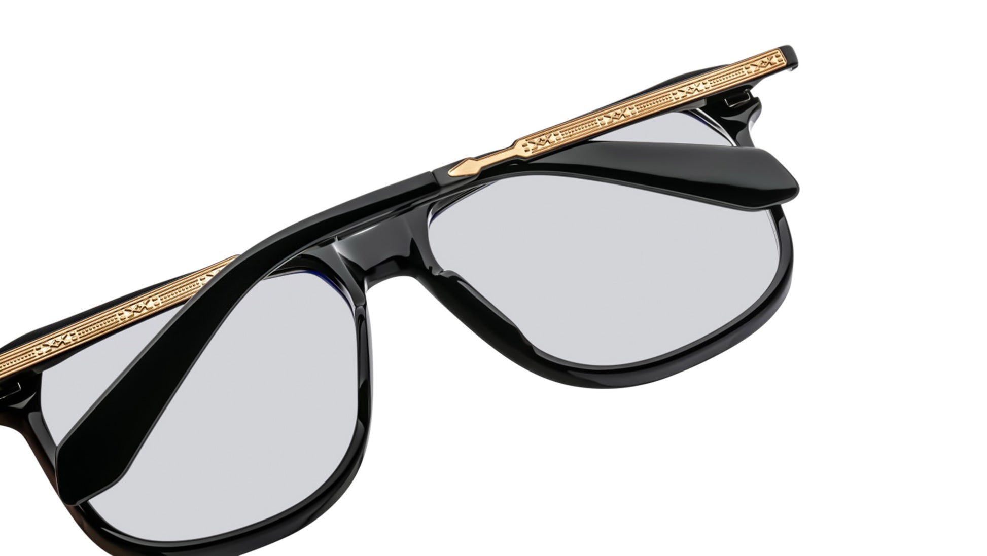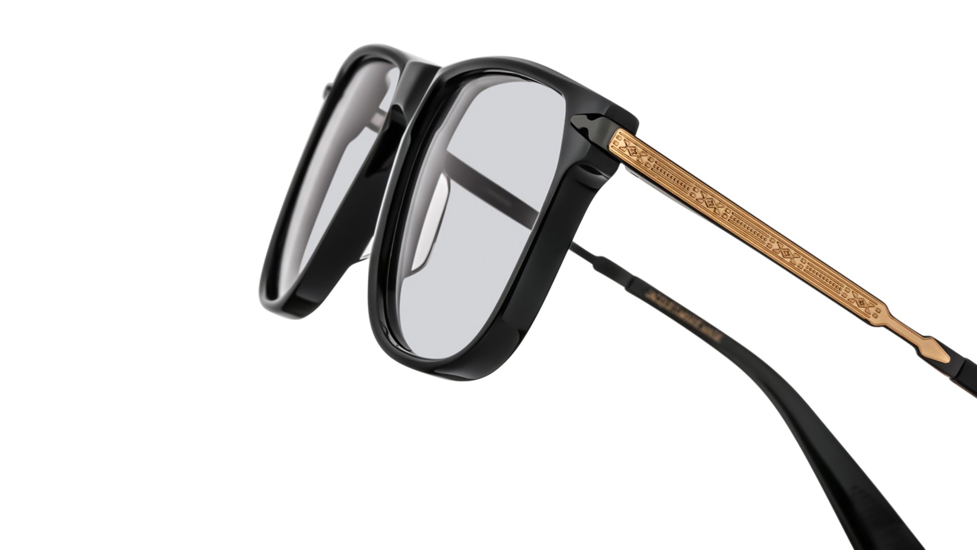 Dark gold 100% beta titanium frame with black accents, complemented by black cured cellulose acetate and light grey lenses. The dark gold engraved titanium temples with acetate tips add a refined touch, while the dark gold tension-secured custom arrowhead monoblock hinge provides durability and style. The black cellulose acetate frame is paired with superlight grey CR-39 4-base lenses, treated with a backside anti-reflective coating for enhanced clarity and comfort. These sunglasses combine luxury, innovation, and performance, making them a sophisticated addition to any collection.