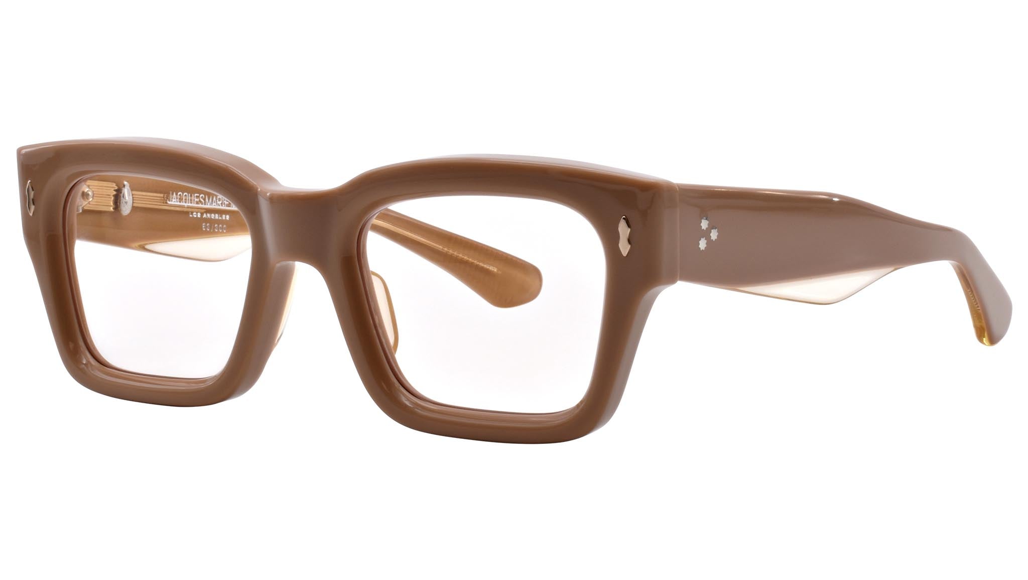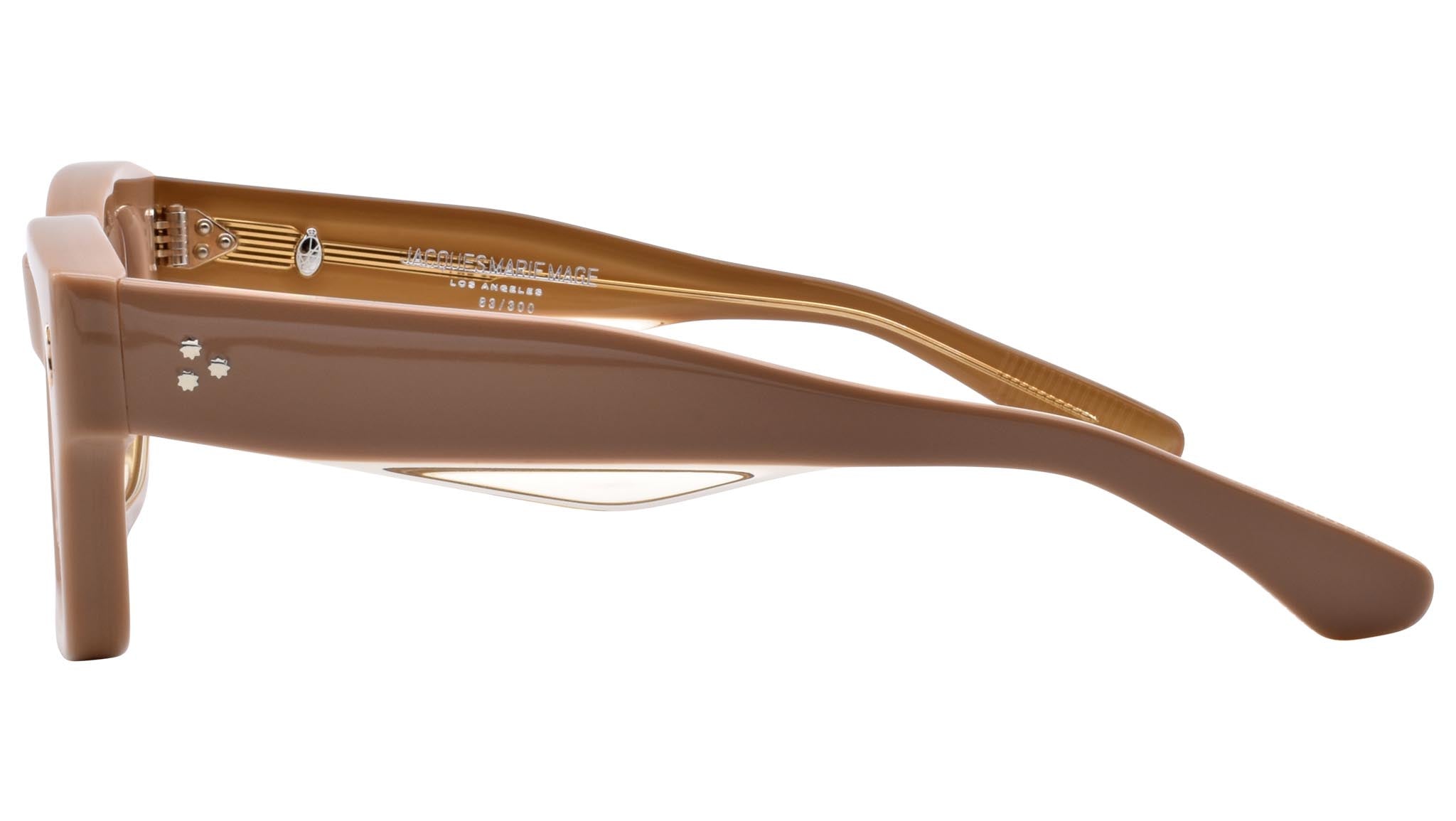 Beige 8 mm cured cellulose acetate frame. Custom double laminated acetate temples and brown lenses. Hidden wirecore. Tension-secured custom 7 barrel hinge. 4 base lens with backside anti-reflective treatment.