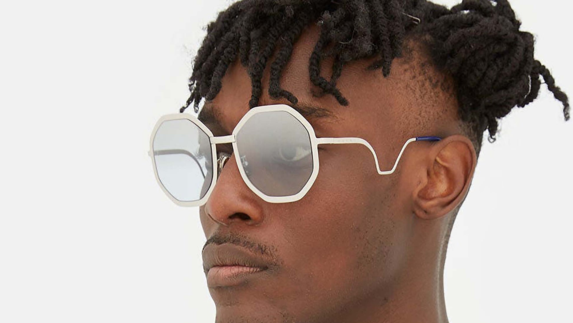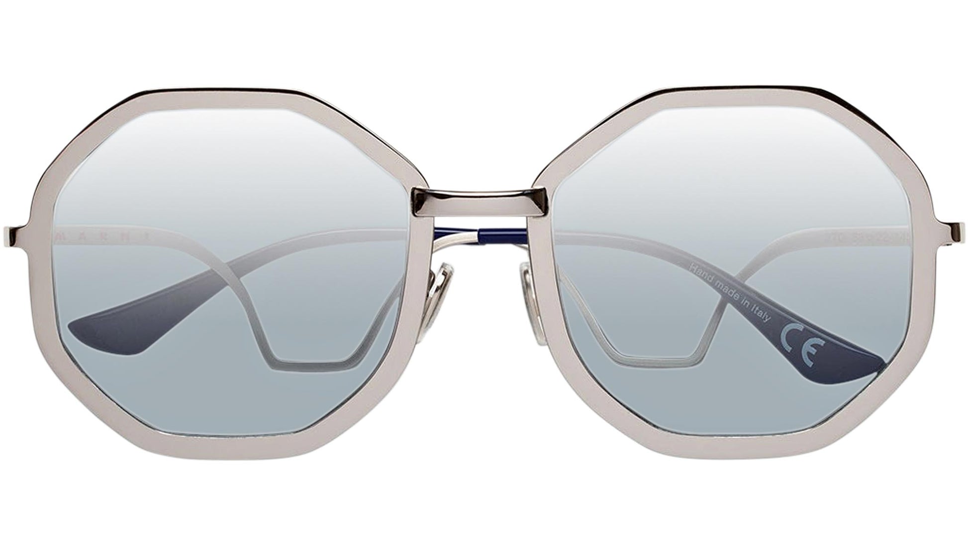 Designed exclusively for Marni, Kamioka Mine is a playful all-metal silhouette characterized by an oversized fit and a geometric shape. The model features octagonal rims encasing wide lenses for extra coverage during sunny winter days. The unique thick metal construction features a lowered nose-bridge and curved temples, ushering in a new era of metal sunglasses. This version features a silver metal finish paired with a light grey fading lens. Sizes: R Lens Width: 58 mm. Frame Front: Frame Side: 145 mm. Product Code Size R: 3TD