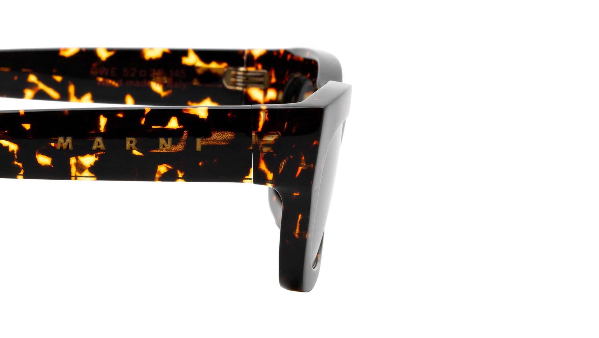 Kawasan Falls was conceived as an everyday essential silhouette, yet with a unique twist. True to Marni’s identity that celebrates quirky personal style, individualism and originality, these squared glasses feature unexpected detailing. Its straight, geometric temples are wide and sturdy to match its thick front, with a prominent nose bridge and angular rims. This version comes in a vibrant Havana finish with black lenses. Sizes: R Lens Width: 52 mm. Frame Front: Frame Side: 145 mm. Product Code Size R: CWE