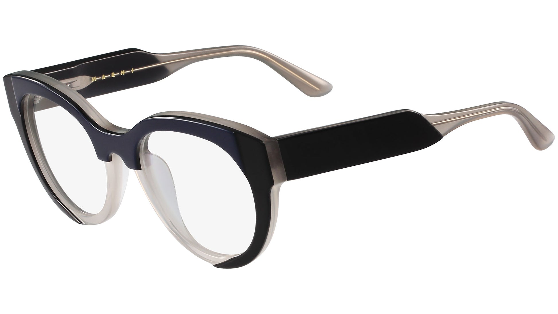 ME2604 413 eyeglasses by Marni featuring blue and black and ice frame and black/ice temple. The culture of colors is one of Marni Eyewear collection pillars. An optimistic, playful and unconventional expression of the brand soul, imagined and manufactured in Italy. The vibrant designs, unique and unexpected, feature multifaceted geometric shapes, where functionality meets the experimental in a constant search for the contemporary.