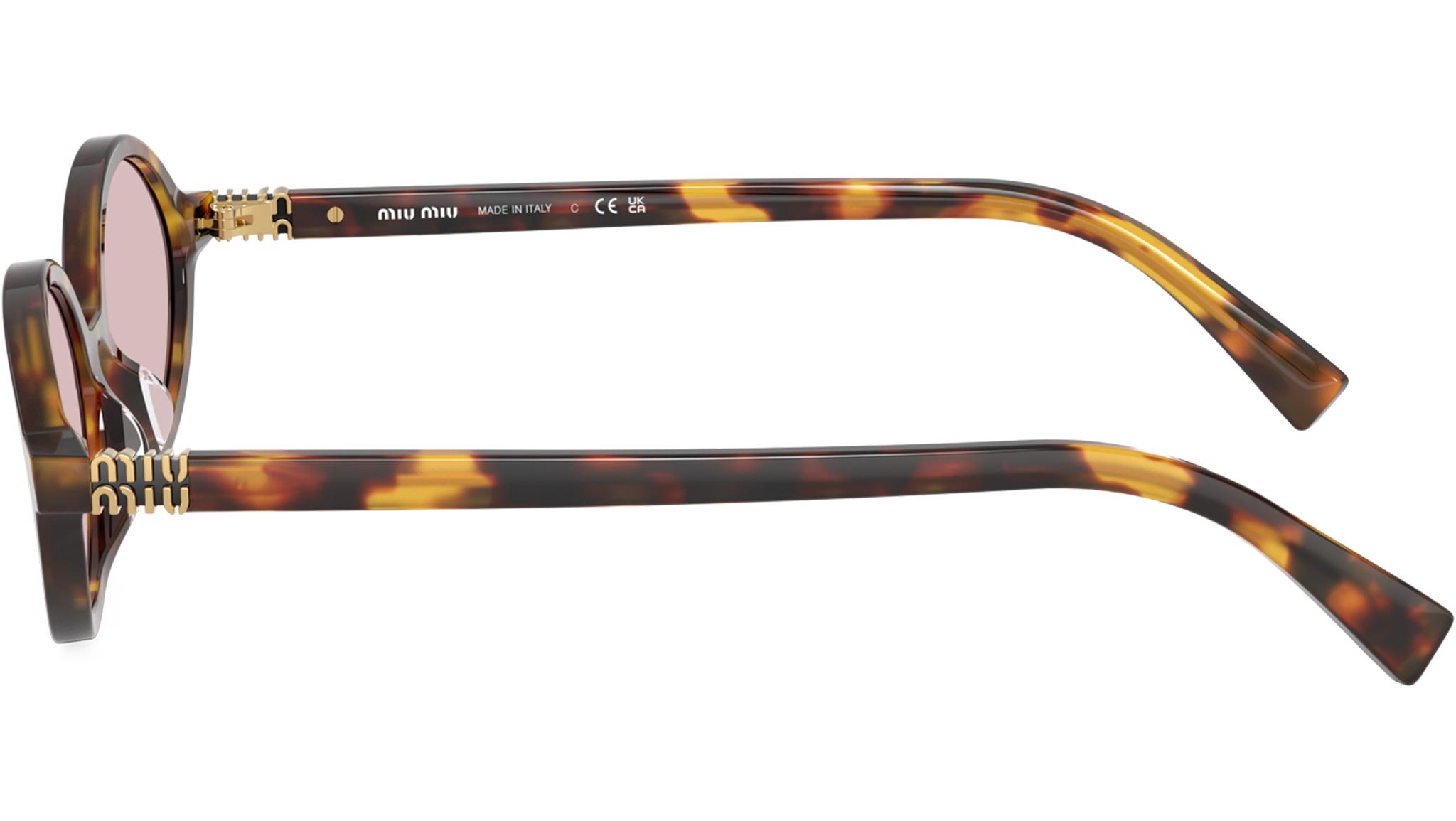Miu Miu MU 04ZS 14L4I0 sunglasses for women, featuring honey havana oval acetate frame and pink bio polyamide lenses. High bridge fit. Brand line: Breaking The Rules. Style code: 0MU 04ZS. Color code: 14L4I0. Made in Italy. Authorized Miu Miu online reseller. Your glasses will include the original case and accessories and are covered by a 12-month global warranty.