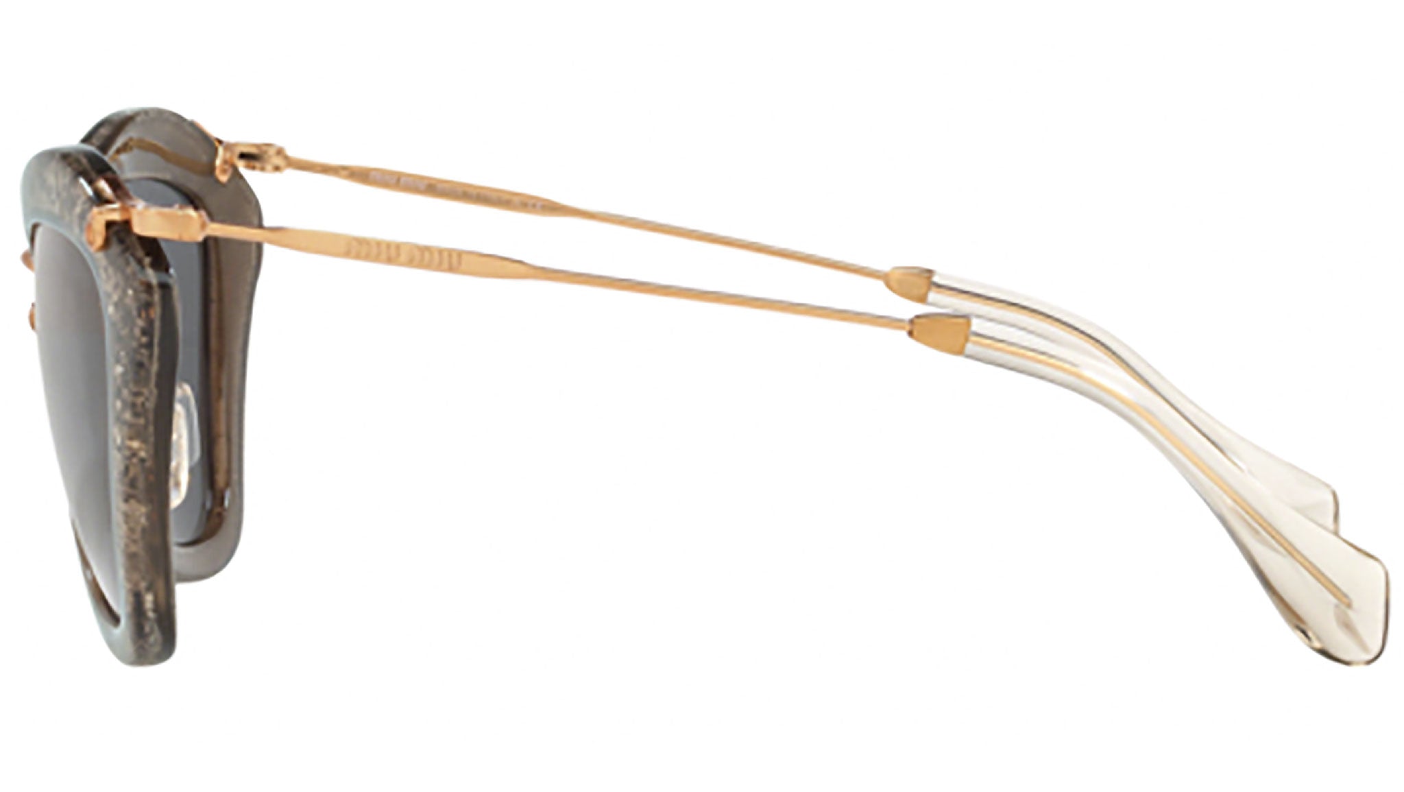 Miu Miu sunglasses model MU 10NS color code IAH1A1 featuring smoke / glitter silver full rim acetate frame and CR-39 grey lenses. The sunglasses within the Miu Miu eyewear collection stand as distinctive masterpieces, products of the brand's relentless stylistic exploration and adept artistry. A harmonious fusion of joyful experimentation and intricate detailing, these sunglasses epitomize the stylistic ethos that has perennially defined the House. This reinforces Miu Miu's undeniable knack for integrating offbeat designs with a touch of retro-tinged romanticism.