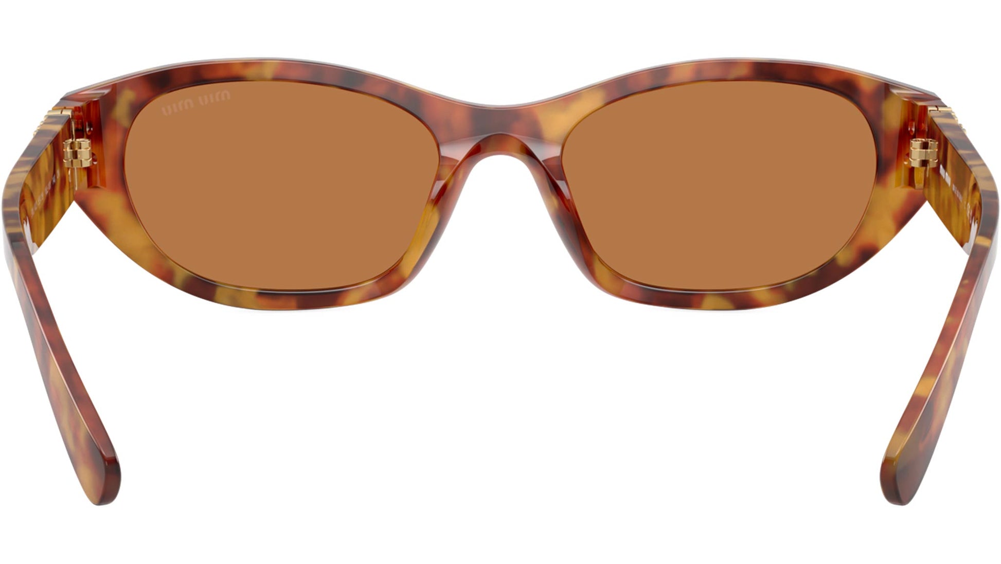Miu Miu MU A03S 10L10I sunglasses for women, featuring light havana geometric acetate frame and brown bio polyamide lenses. High bridge fit. Brand line: Miu Glimpse. Style code: 0MU A03S. Color code: 10L10I. Made in Italy. Authorized Miu Miu online reseller. Your glasses will include the original case and accessories and are covered by a 12-month global warranty.