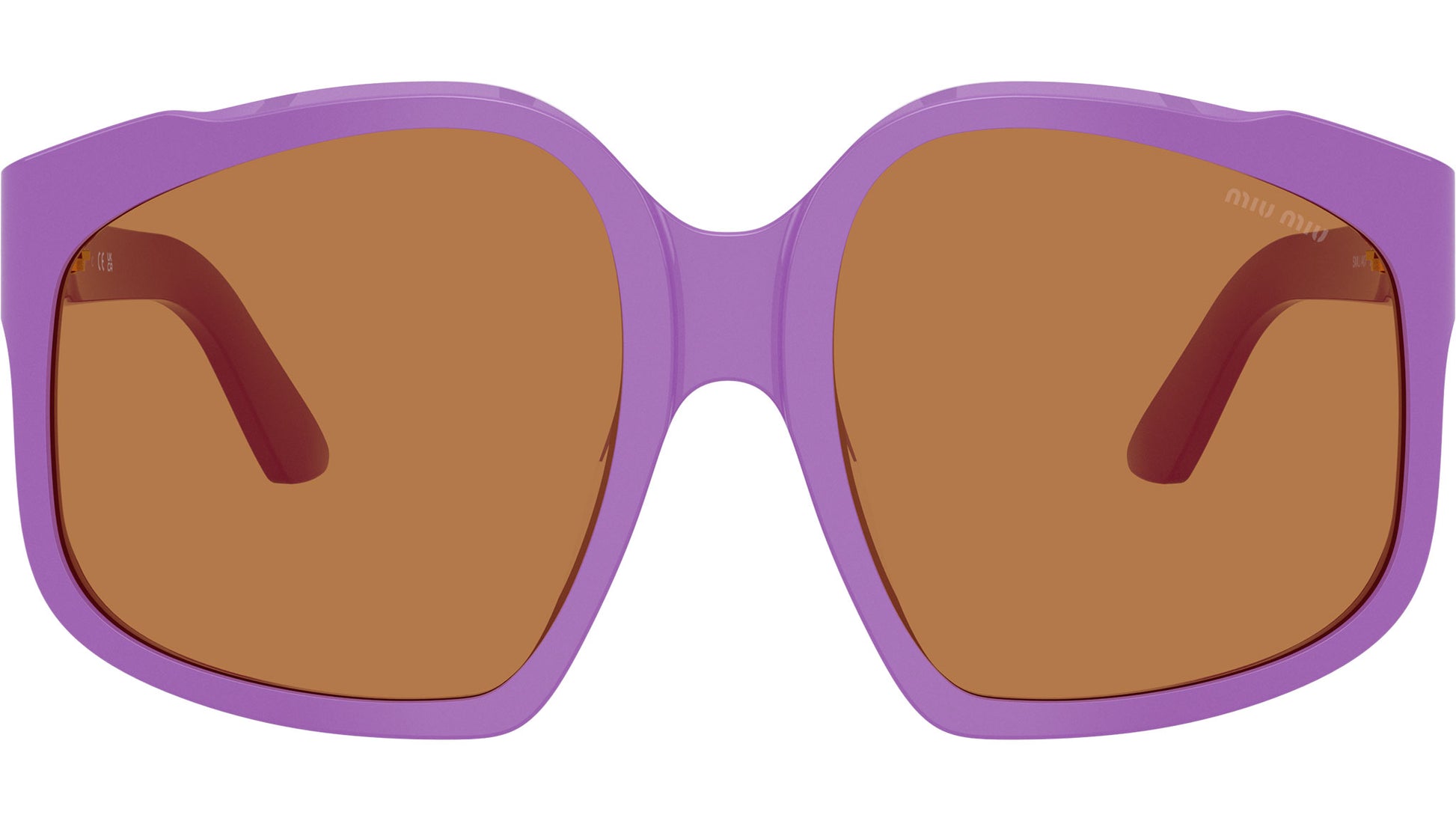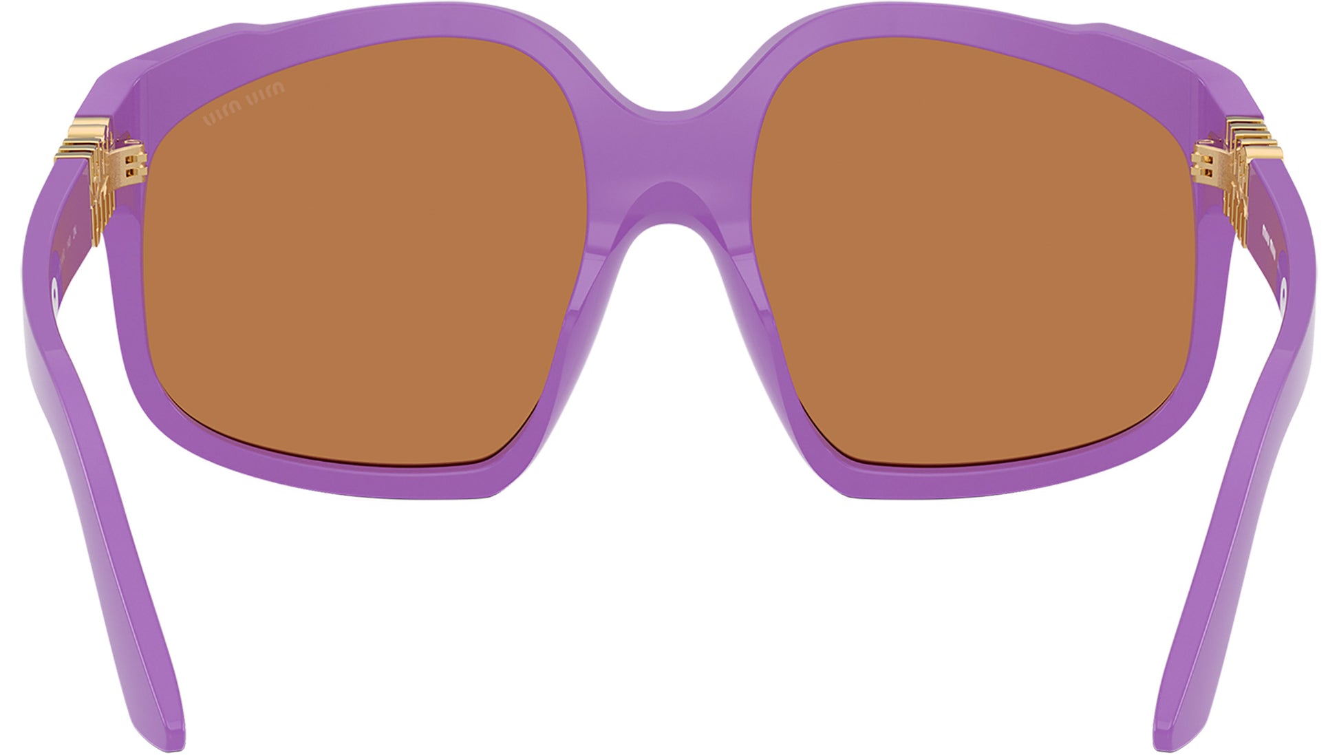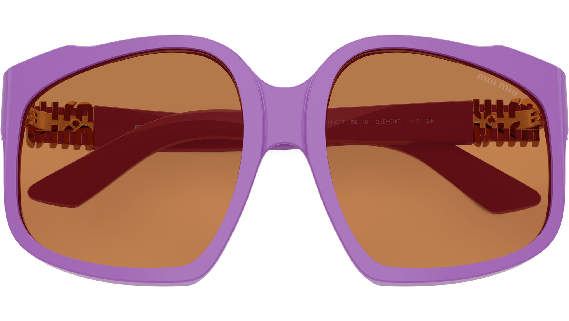Miu Miu MU A07S 25D90Q sunglasses for women, featuring violet geometric acetate frame and brown bio polyamide lenses. High bridge fit. Brand line: Fashion Show. Style code: 0MU A07S. Color code: 25D90Q. Made in Italy. Authorized Miu Miu online reseller. Your glasses will include the original case and accessories and are covered by a 12-month global warranty.