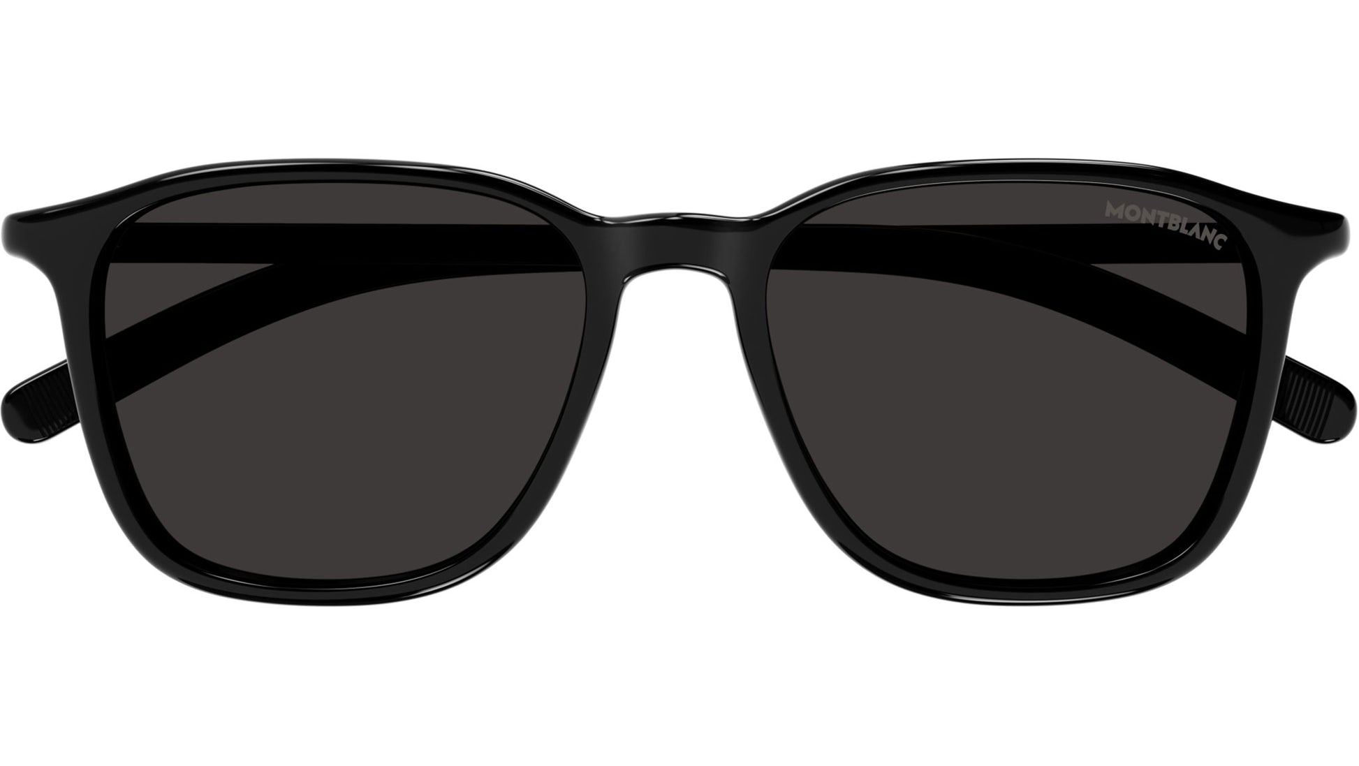 Montblanc sunglasses model MB0325S Snowcap line panthos recycled injected acetate frame, color code 001 shiny black with black temple and solid grey lens.