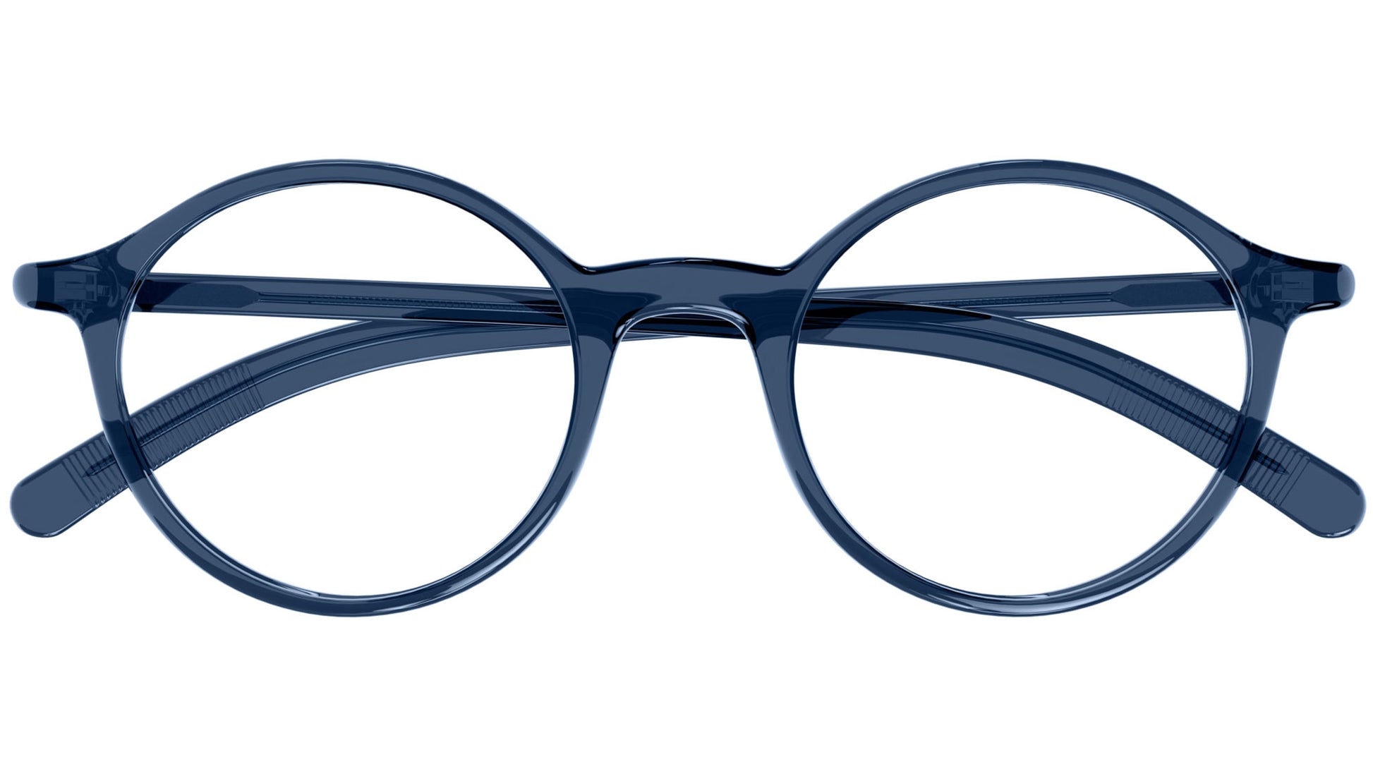 Montblanc eyewear Snowcap line model MB0350O, panthos recycled injected acetate glasses color code 004 shiny transparent blue with blue temple and demo lens. Authorized Montblanc online reseller. Your glasses will come with the original case and accessories and will be covered by a 12-month global warranty.