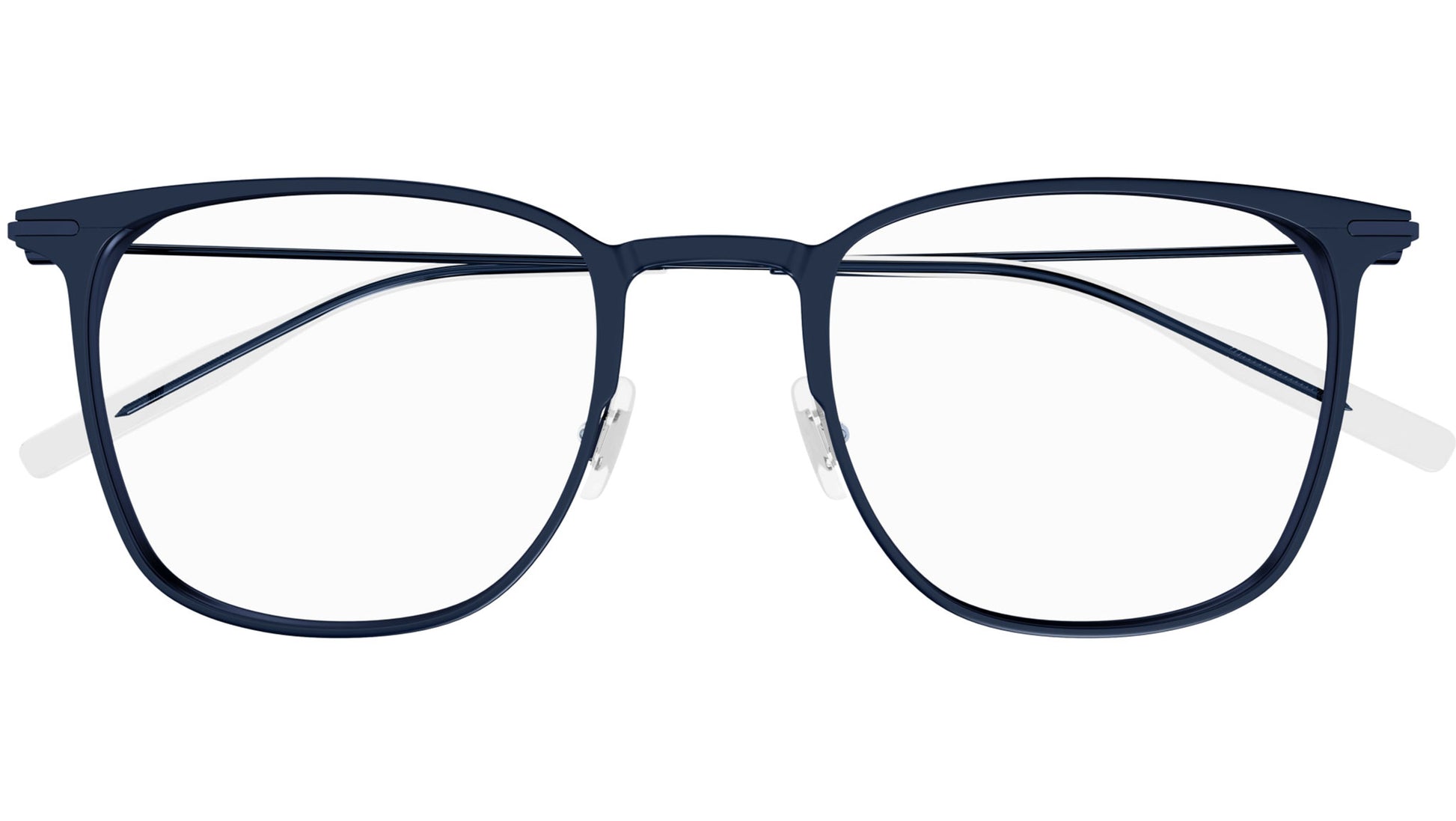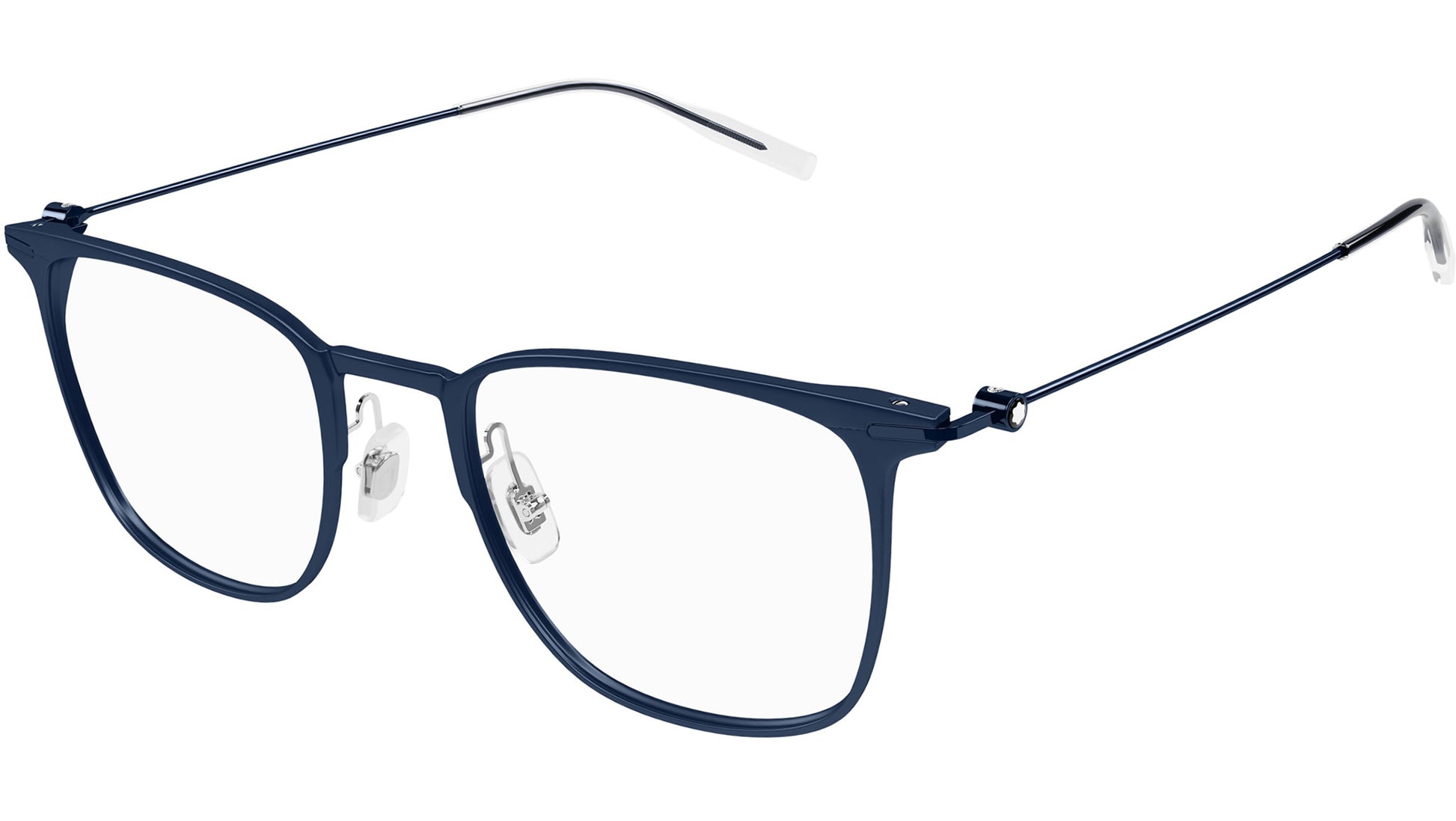 Montblanc eyewear Snowcap line model MB0356O, rectangle aluminium glasses in semimatte dark blue with blue temple and demo lens. Authorized Montblanc online reseller. Your glasses will come with the original case and accessories and will be covered by a 12-month global warranty.