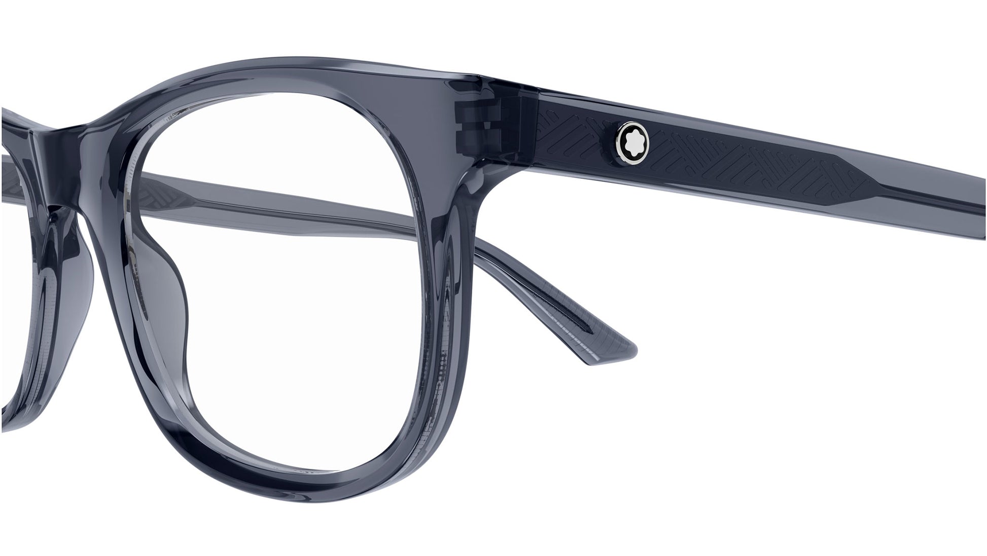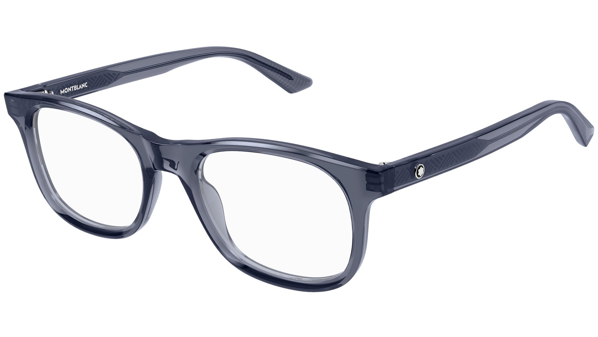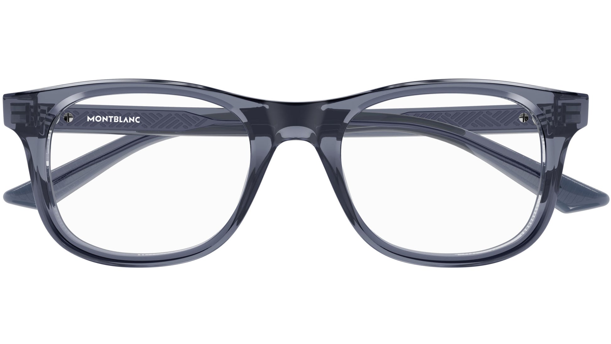 Montblanc MB0385O glasses for men, featuring shiny transparent grey / blue rectangular recycled acetate frame and demo lenses. Brand line: Snowcap. Style code: MB0385O. Color code: size 54: 010. Size 52: 001. Made in Italy. Authorized Montblanc online reseller. Your glasses will include the original case and accessories and are covered by a 12-month global warranty.