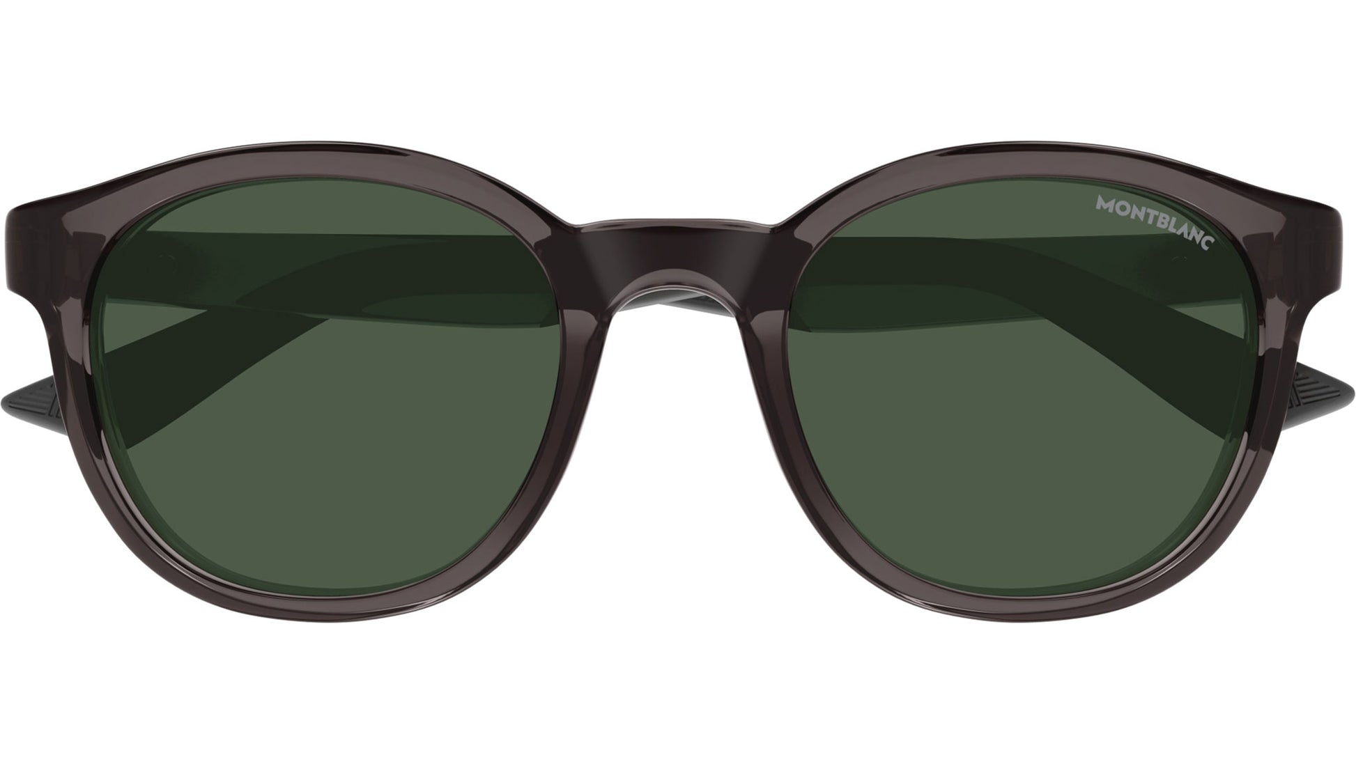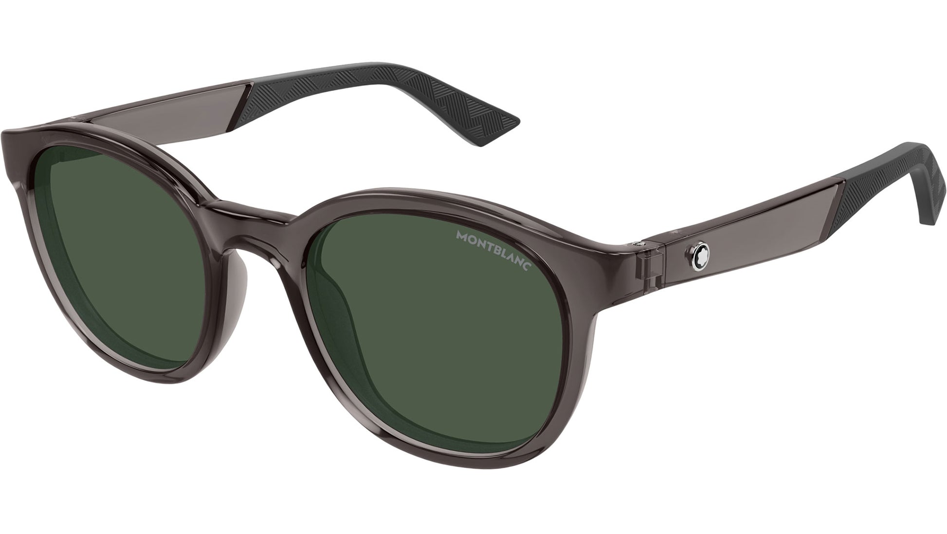 Montblanc MB0398S 003 sunglasses for men, featuring shiny transparent grey panthos injection frame and solid dark green bio nylon lenses. Brand line: Extreme. Style code: MB0398S. Color code: 003. Made in Japan. Authorized Montblanc online reseller. Your glasses will include the original case and accessories and are covered by a 12-month global warranty.