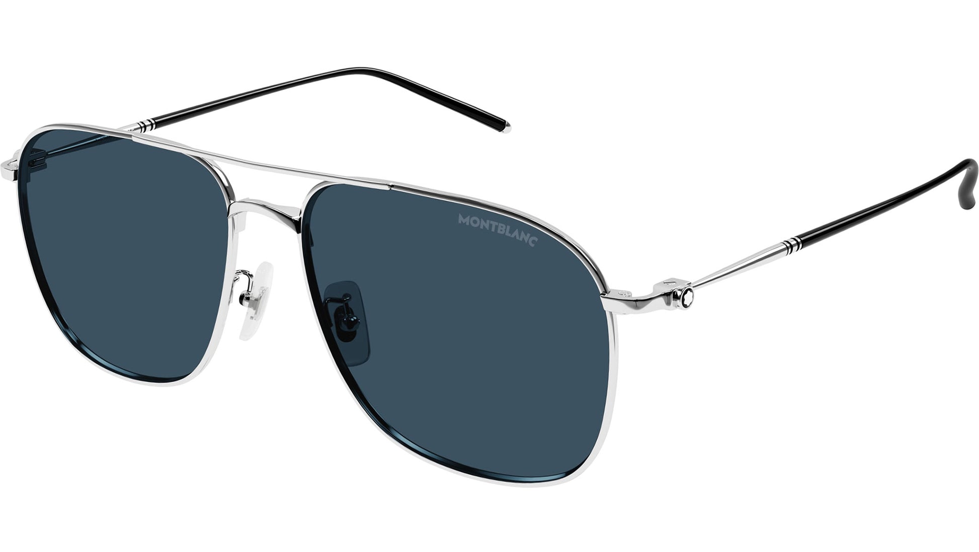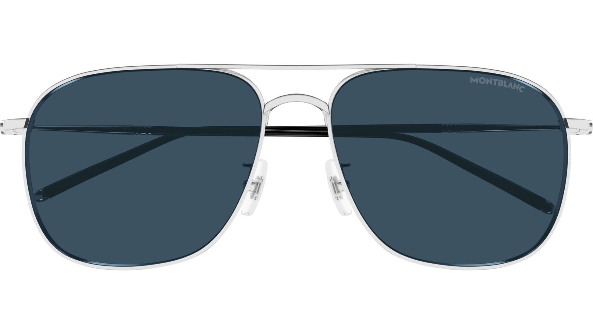 Montblanc MB0417SA 004 sunglasses for men, featuring shiny silver pilot titanium frame and solid blue bio nylon lenses. Brand line: CN Capsule. Style code: MB0417SA. Color code: 004. Made in Japan. Authorized Montblanc online reseller. Your glasses will include the original case and accessories and are covered by a 12-month global warranty.