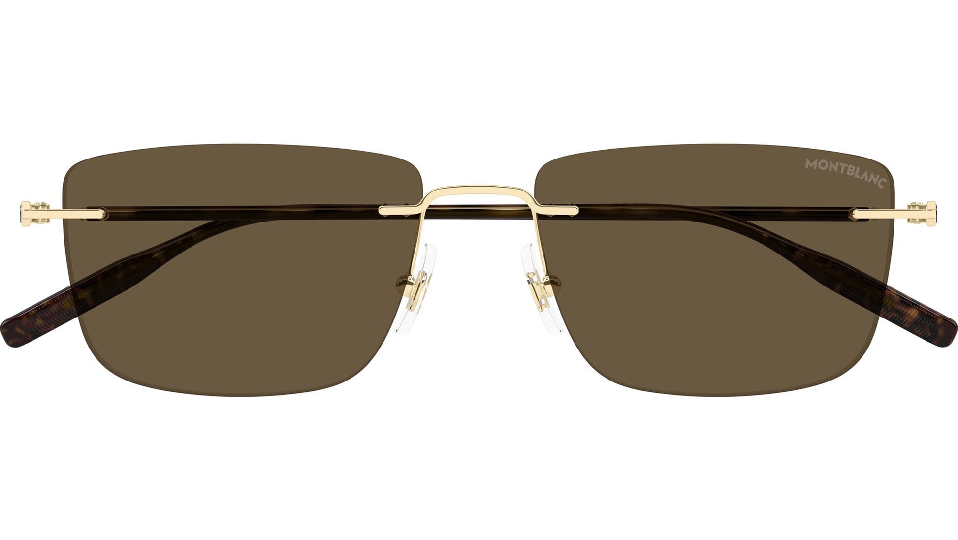 Montblanc MB0429S 005 sunglasses for men, featuring shiny light gold rectangular metal frame and solid brown bio nylon lenses. Brand line: Snowcap. Style code: MB0429S. Color code: 005. Made in Italy. Authorized Montblanc online reseller. Your glasses will include the original case and accessories and are covered by a 12-month global warranty.