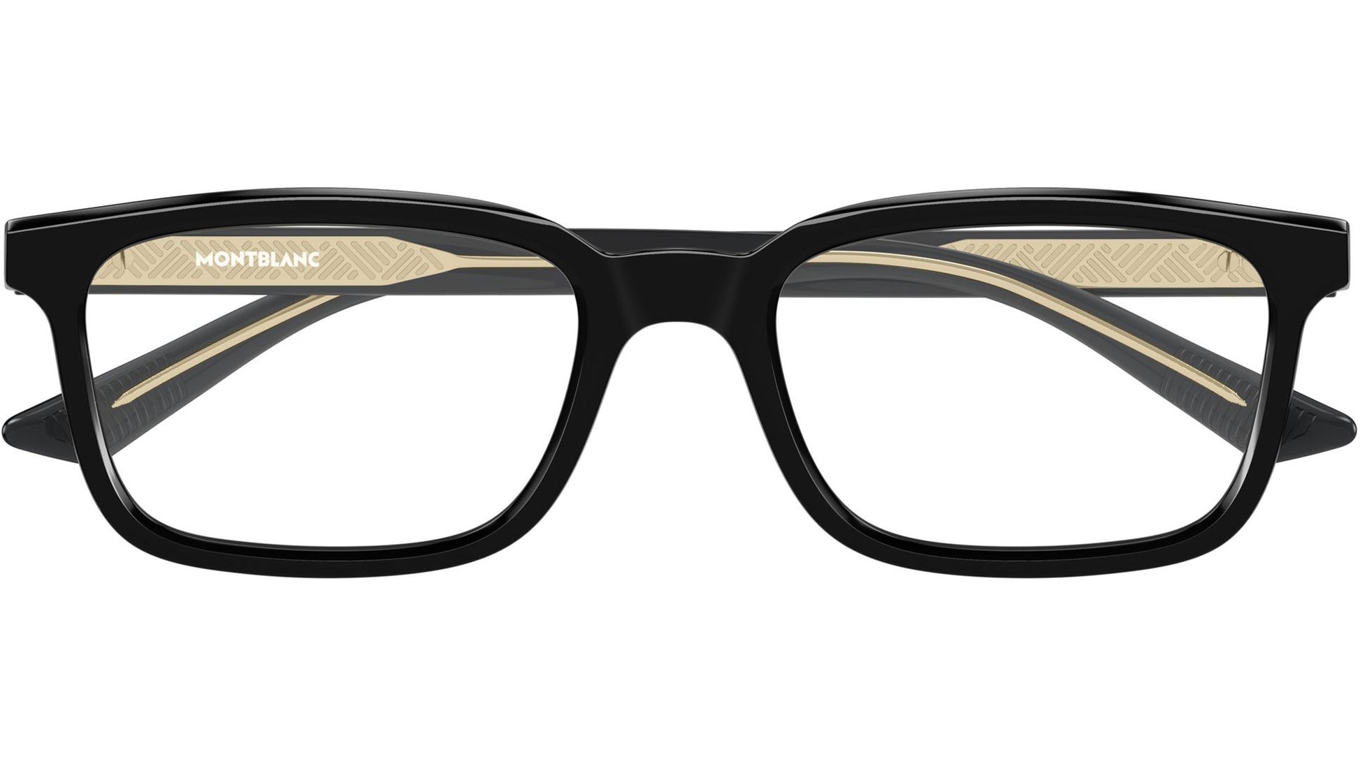 Montblanc MB0458OL glasses for men, featuring shiny solid black rectangular recycled acetate frame and demo lenses. Brand line: Snowcap. Style code: MB0458OL. Color code: size 58: 006. Size 55: 003. Made in Italy. Authorized Montblanc online reseller. Your glasses will include the original case and accessories and are covered by a 12-month global warranty.