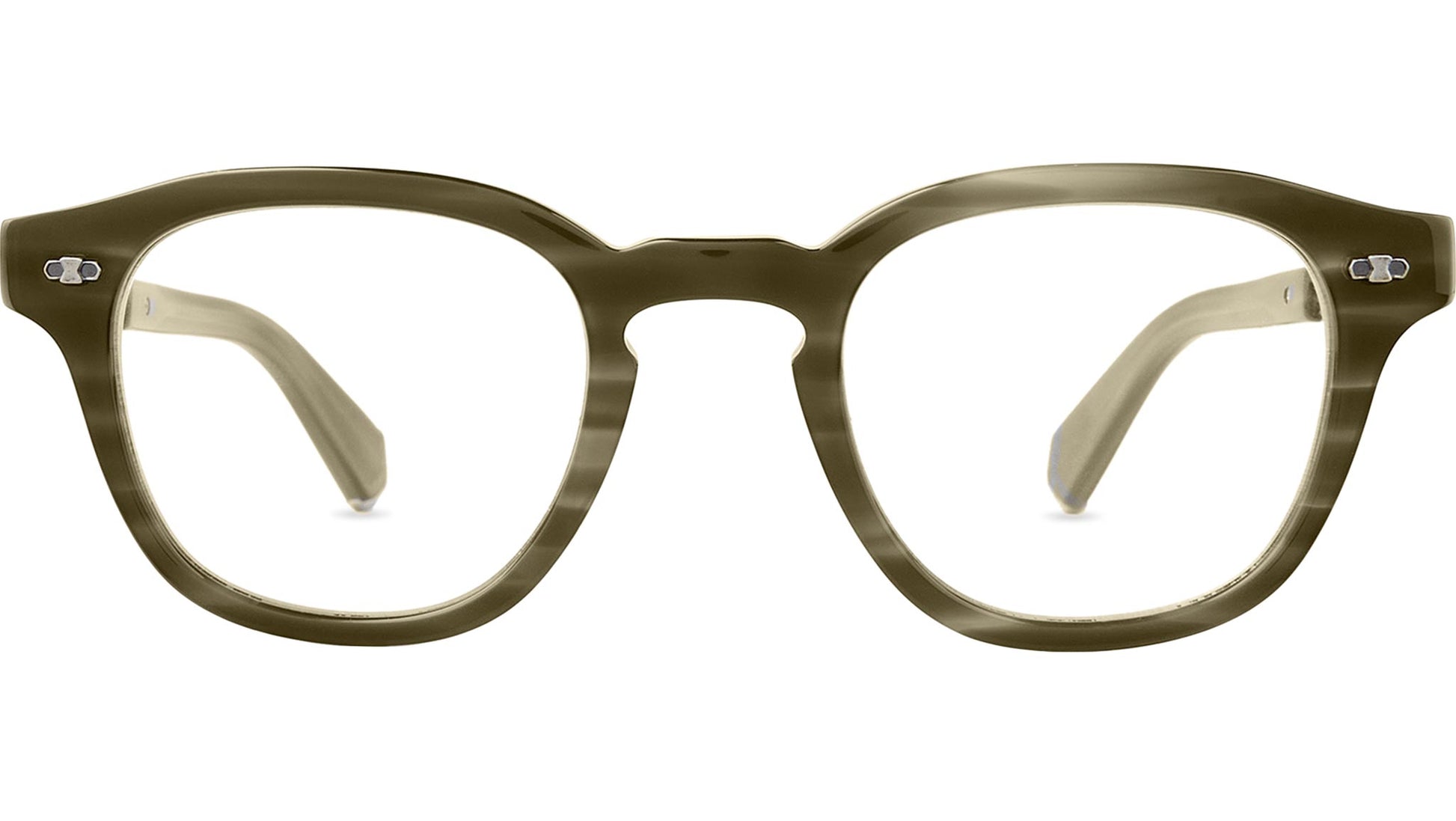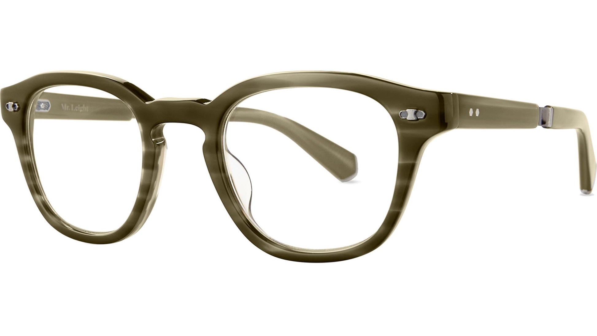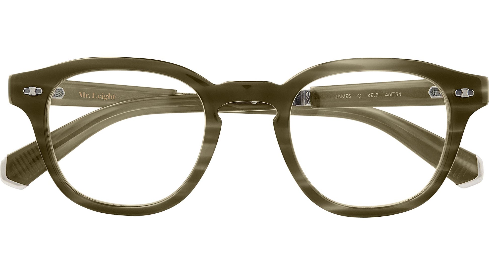 Mr. Leight James C glasses featuring kelp / pewter squared acetate-metal frame and demo lenses. The Mr. Leight James C showcases a refined interpretation of a classic eyewear style. This design features subtle angles along the top line and a Geo plaque that enhance the frame's distinguished aesthetic. Crafted in Japan, the frame is constructed from cured cellulose acetate and incorporates a custom Topography engraved metal core wire. It includes optical quality CR-39 lenses with a 4 Base curvature and a backside anti-reflective coating for improved clarity. The flexible titanium coil temples ensure a comfortable fit, while the keyhole nose bridge and custom hexagon riveted pins on the temples add distinctive touches. Additionally, the custom engraved hinge with an enamel-filled Mr. Leight logo cap and 3 barrel hinges enhance durability, complemented by metal temple tips. This unisex model combines elegance and functionality. Style code: ML1050. Color code: KLP-PW. Authorized Mr. Leight online reseller. Your glasses will include the original case and accessories and are covered by a 12-month global warranty.