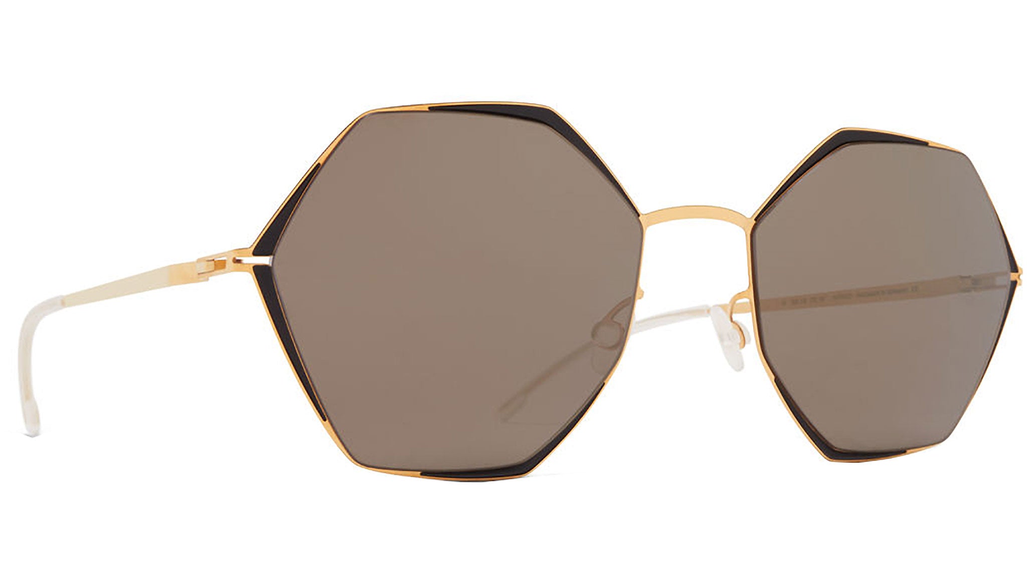 Made of lightweight stainless steel, ALESSIA in Gold/Jet Black with Brilliant Grey Solid lenses is a square shaped sunglass frame from the MYKITA DECADES collection with a geometric rim design. Handcrafted in Berlin.
