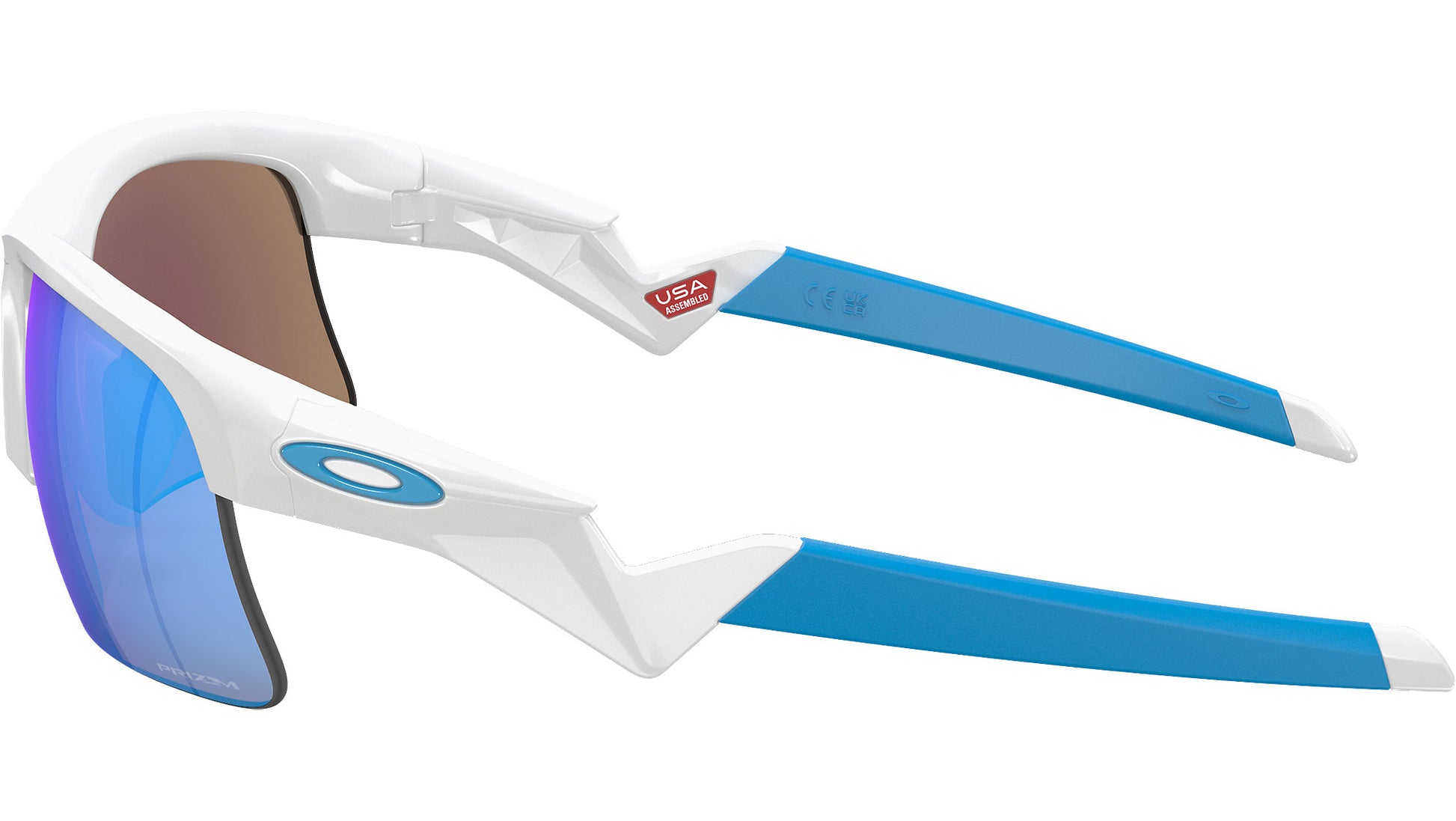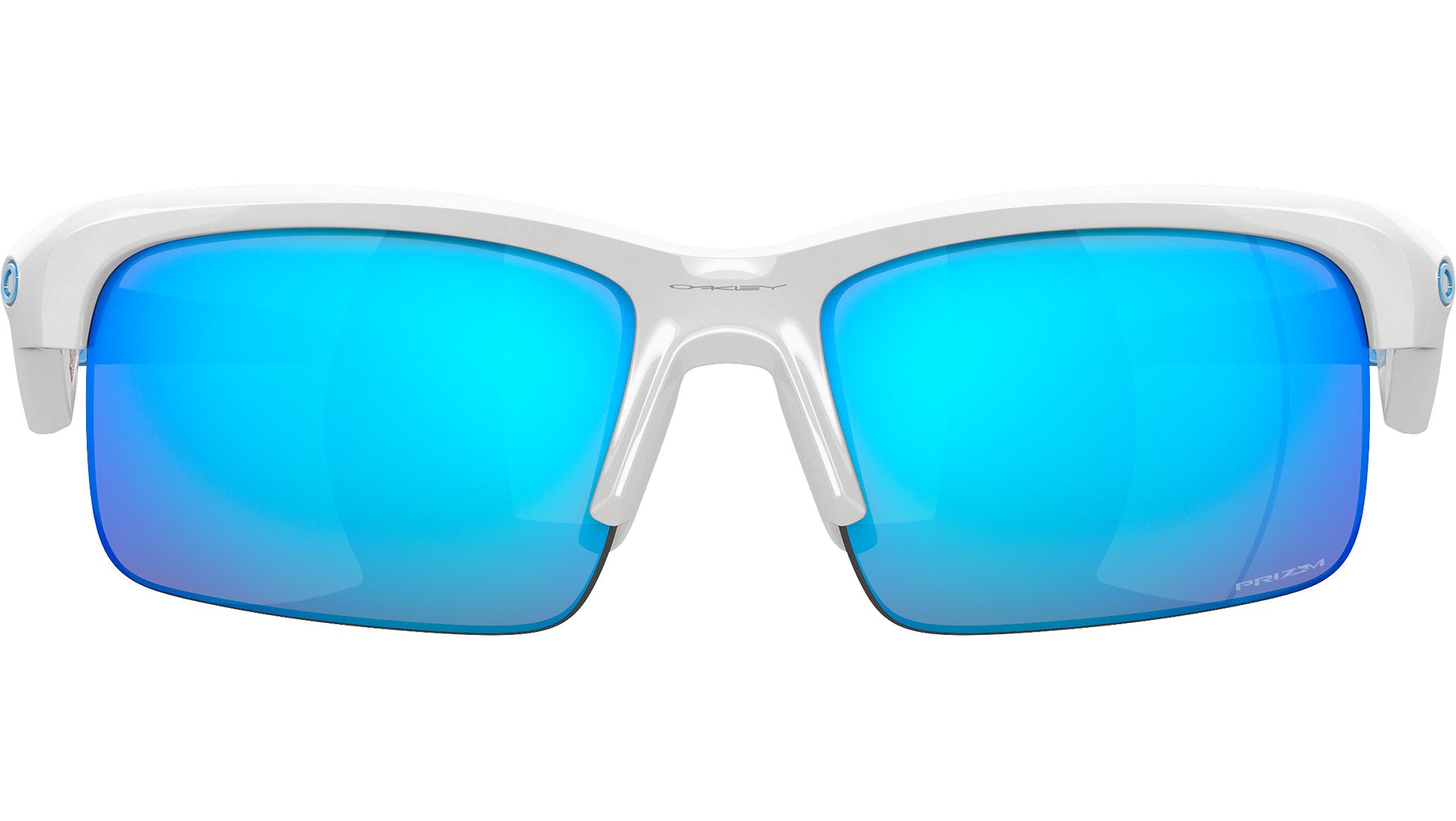 Oakley Youth unisex sunglasses model OJ9013 featuring polished white semi rim nylon frame and polycarbonate prizm sapphire lenses. High bridge fit. Frame line: Sport Performance. Brand code: 0OJ9013. Color code: 901302. Authorised Oakley Online Reseller. Your glasses will include the original case and accessories and will be covered by 12 month global warranty.