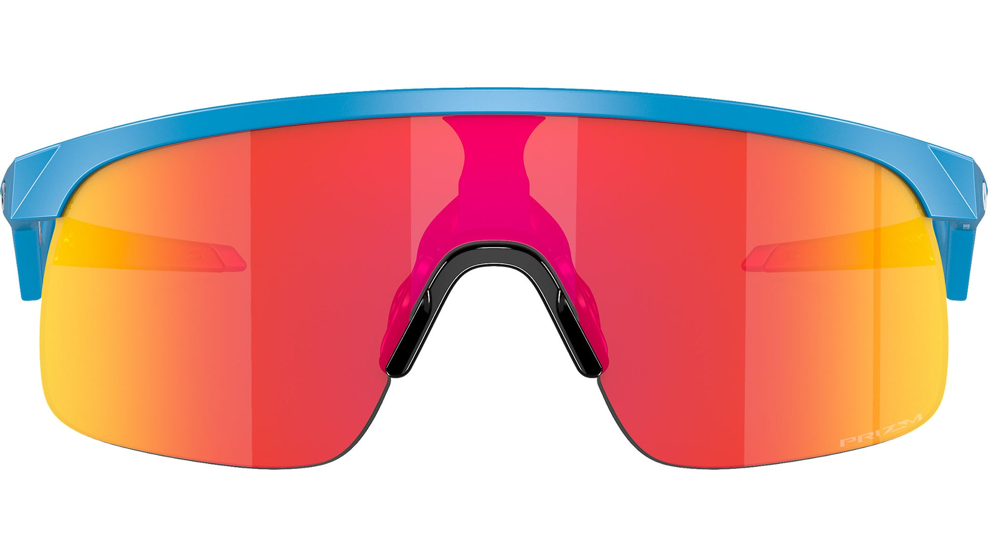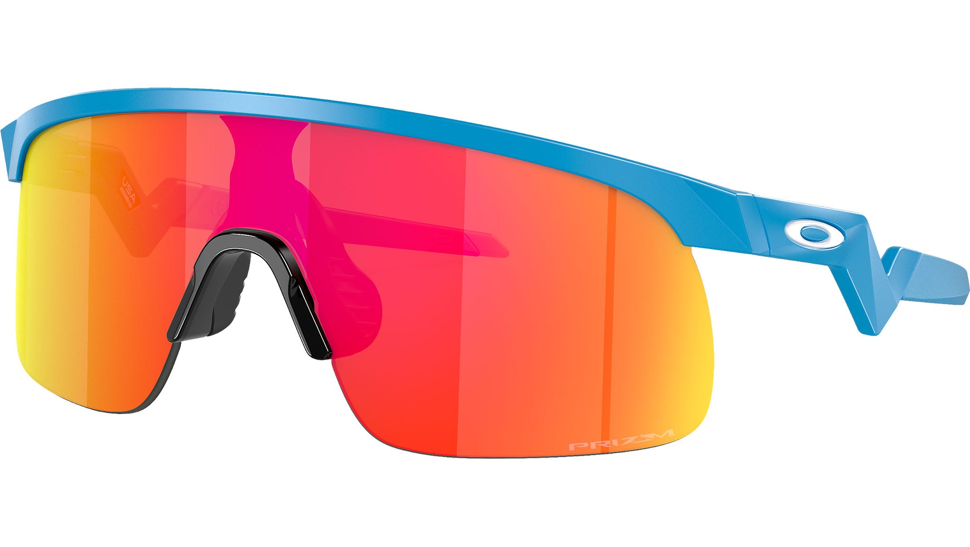 Oakley Youth sunglasses for boys model OJ9010 featuring sky blue semi rim nylon frame and polycarbonate prizm ruby lenses. High bridge fit. Frame line: Sport Performance. Brand code: 0OJ9010. Color code: 901005. Authorised Oakley Online Reseller. Your glasses will include the original case and accessories and will be covered by 12 month global warranty.