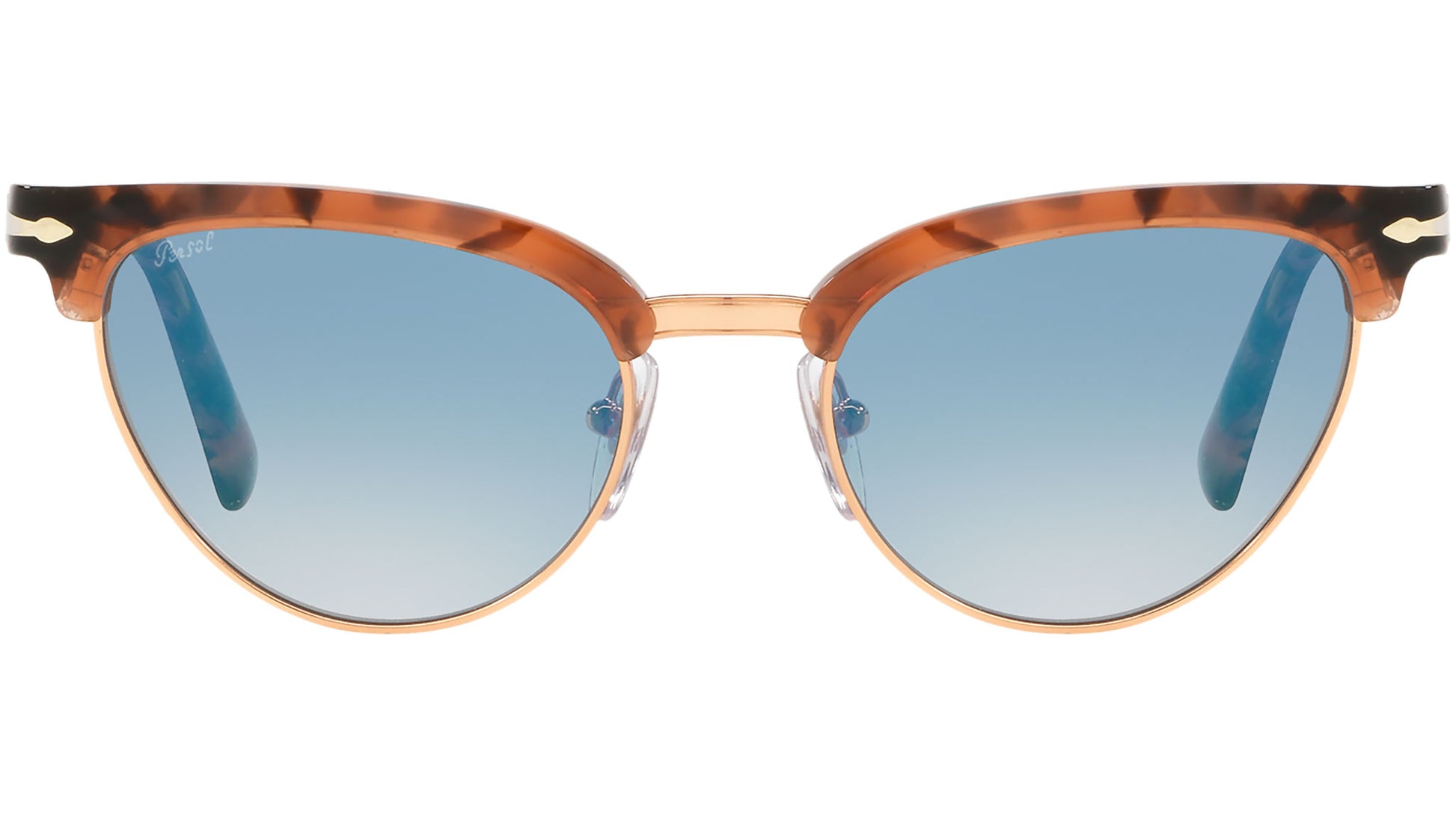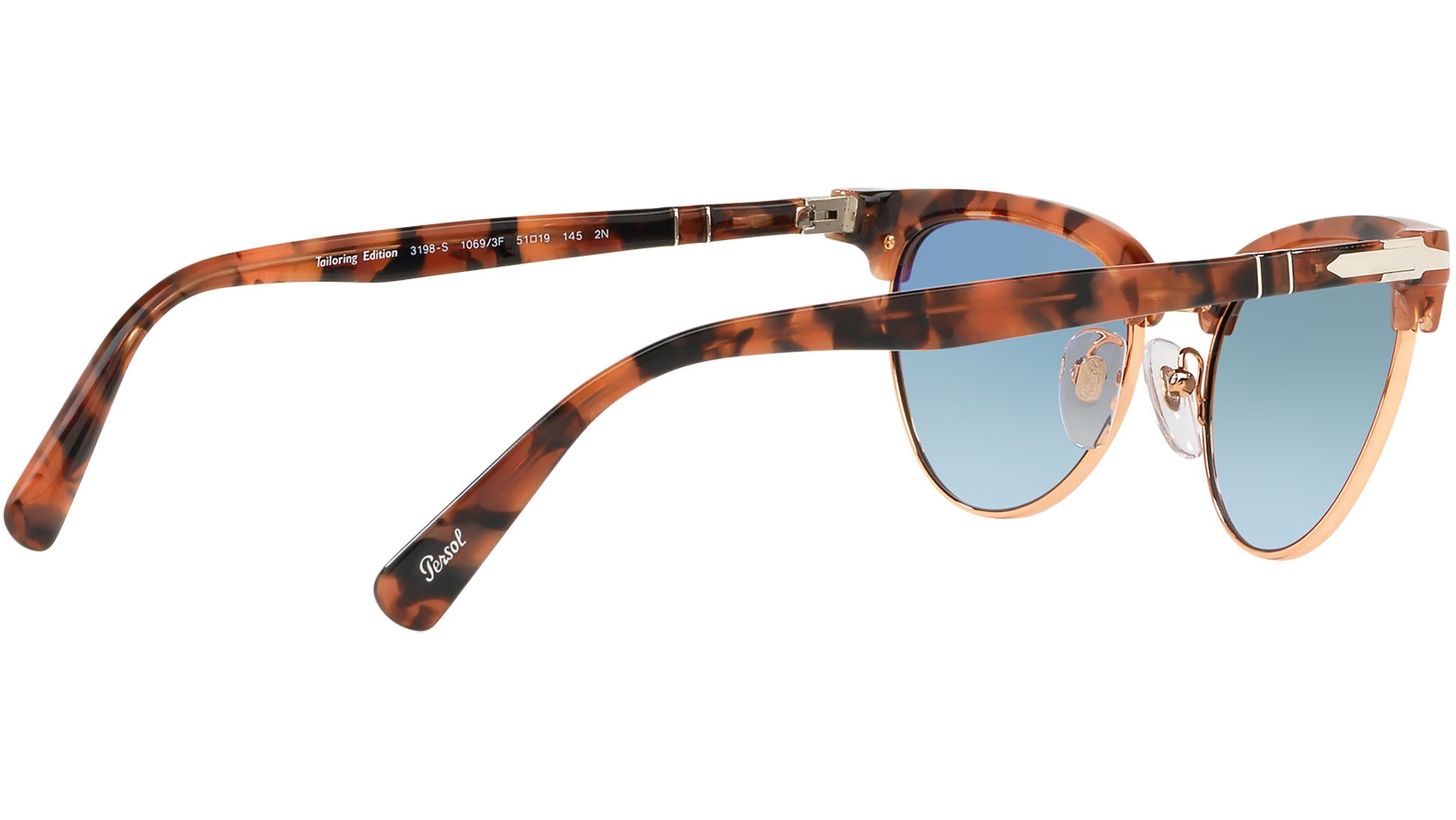 Persol sunglasses model PO3198S color code 10693F featuring pink tortoise full rim acetate frame and glass blu sfumato lenses. Meticulous attention to every intricate detail ensures distinct styles and practical solutions. Driven by an unwavering passion for skill refinement and an unrelenting pursuit of innovation, Persol embodies true quality. Embodying its evocative name, which signifies “for sun” this brand stands as a testament to a rich heritage of superior craftsmanship and excellence. Persol seamlessly blends aesthetics and technology, representing the epitome of handcrafted Italian manufacturing. Renowned for its timeless design and artistry, the brand has become a beloved choice within the realm of cinema.