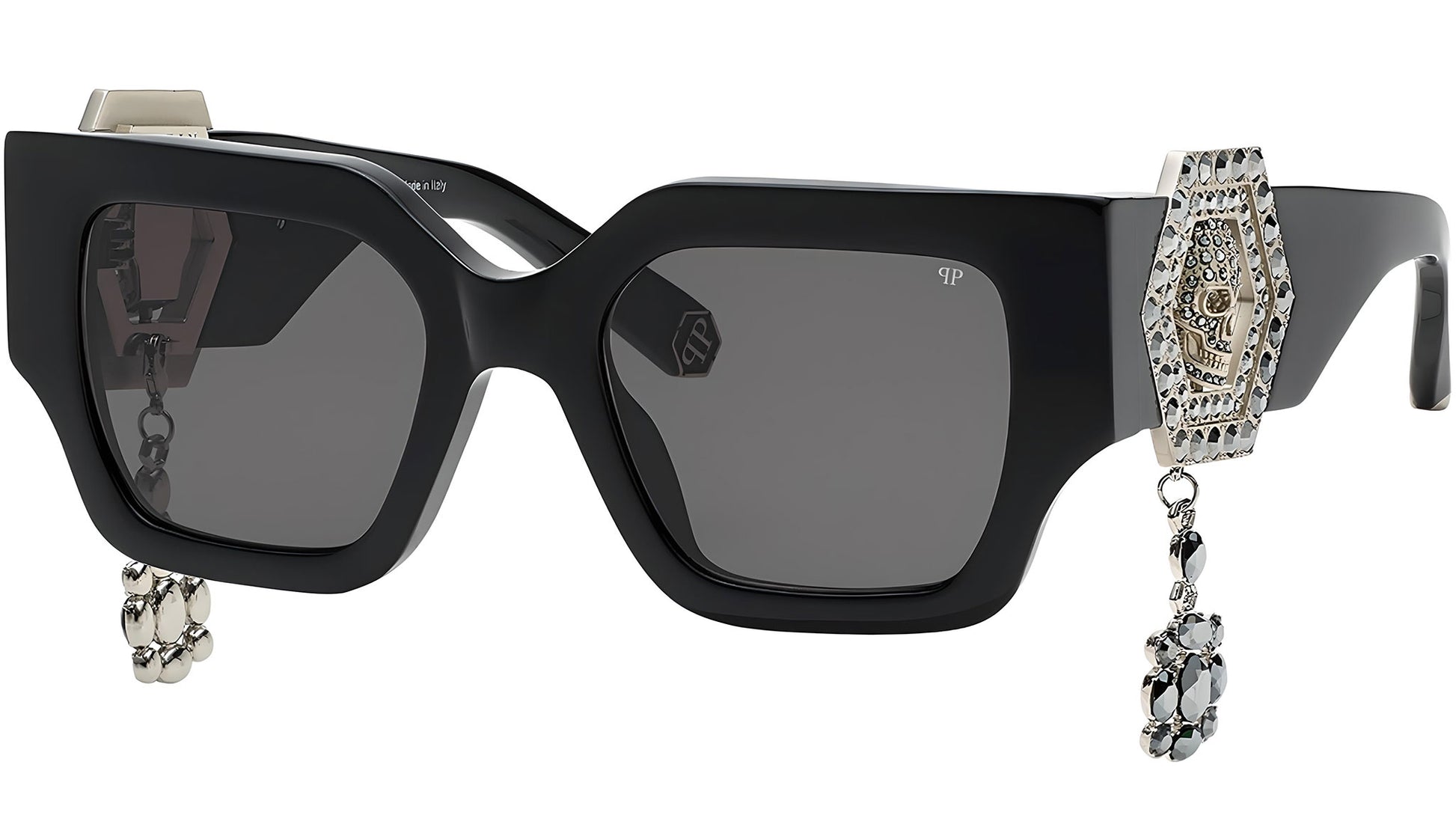 SPP103S Square 0700 shiny black Sunglasses. Discover the essence of unbridled luxury and edgy style with Philipp Plein eyewear. Crafted for the passionate individualist, each pair embodies the brand's commitment to extraordinary design, beauty, and rock and roll spirit. With their provocative, maximalist aesthetics, these sunglasses and optical frames are not just accessories but bold statements of personal style. Philipp Plein's sumptuous and innovative approach to fashion transforms your vision into reality. Perfect for those who dare to stand out.