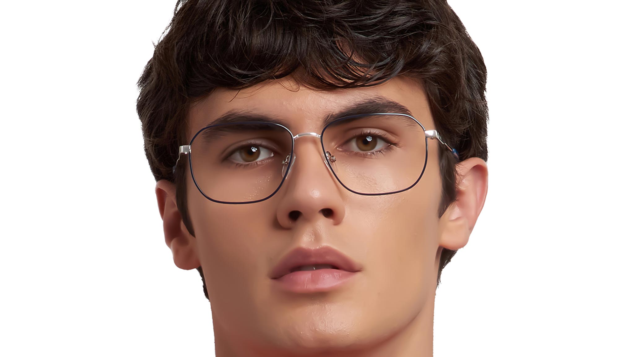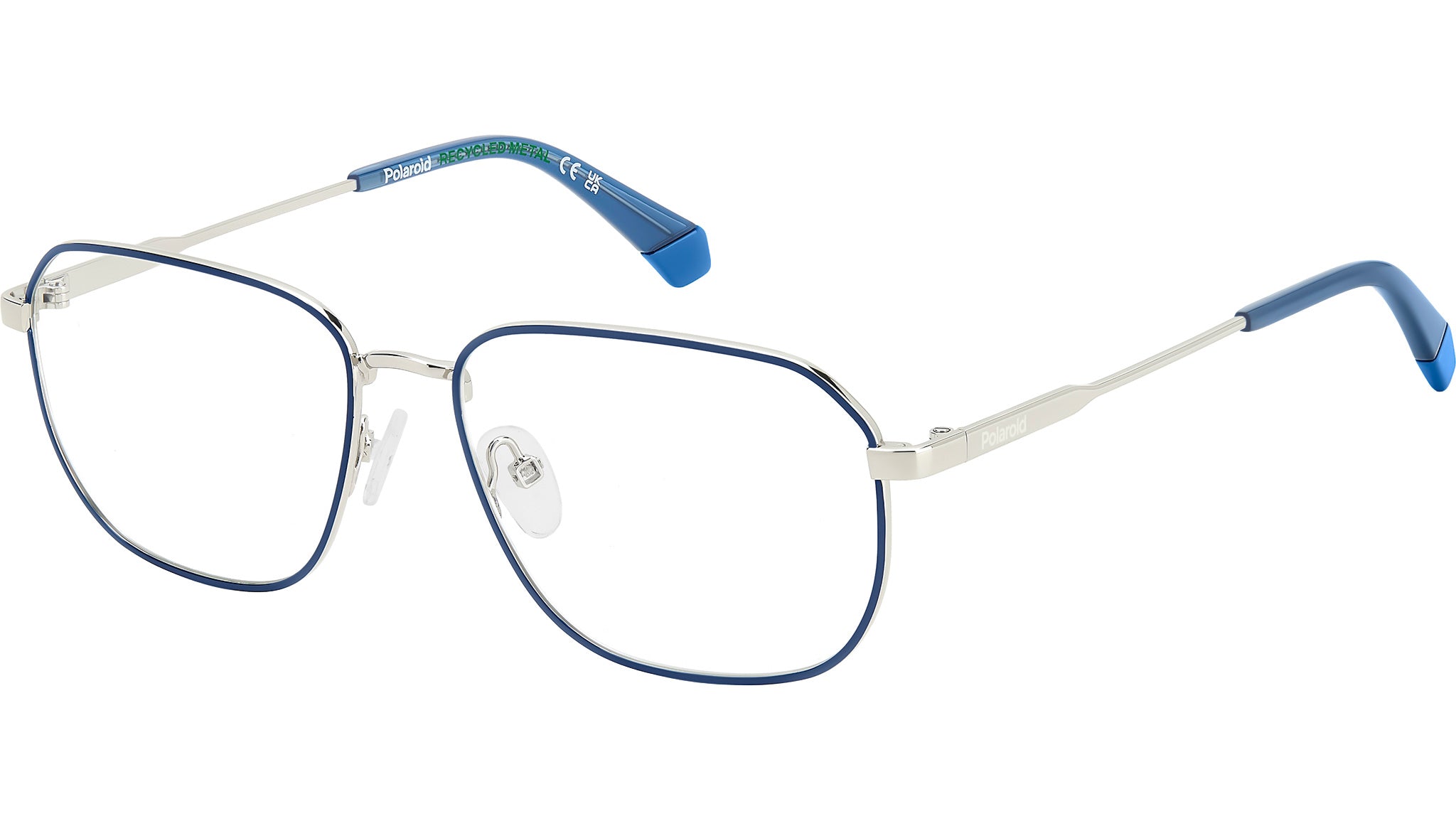 Polaroid PLD D538 DOH glasses for men, featuring palladium blue rectangular metal frame and demo lens lenses. These Polaroid glasses for men are the key piece when it comes to curating refined looks. Not only that, but their minimalist design is complemented by a geometric shape, giving them a surprising twist. Putting them on is all it takes to fall in love with their lightweight feel and comfortable fit, enhanced by adjustable nose pads. The Polaroid logo trims the recycled metal structure, a choice made to stay true to sustainable fashion. Brand line: Cool. Style code: 108842. Color code: DOH. Authorized Polaroid online reseller. Your glasses will include the original case and accessories and are covered by a 12-month global warranty.