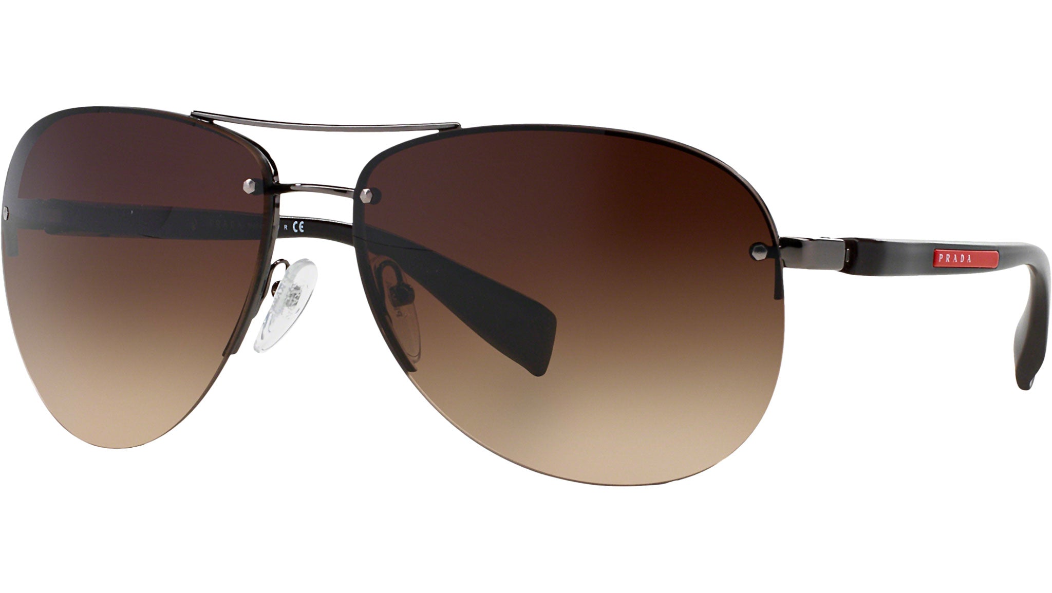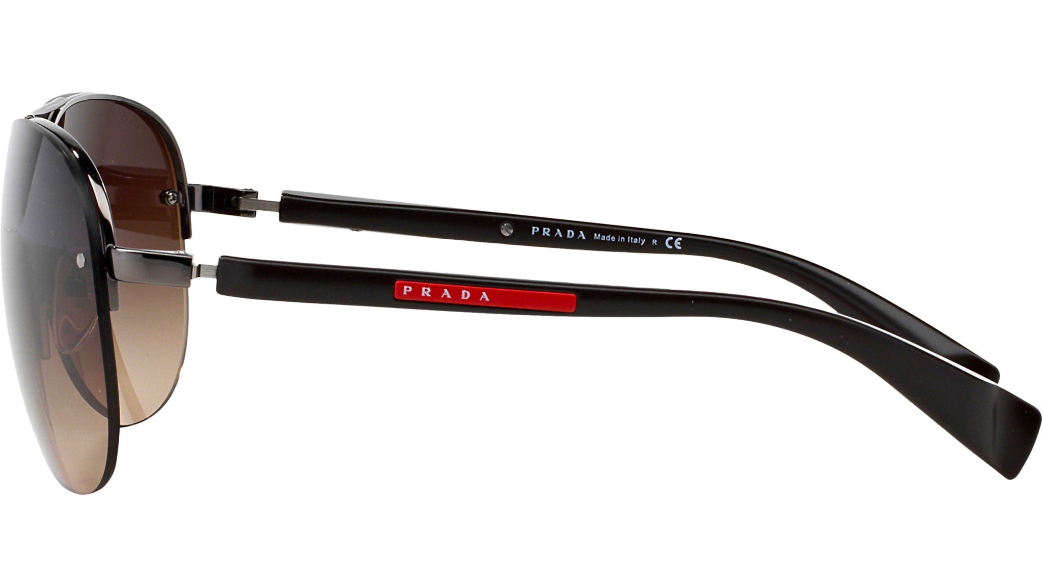 Prada Linea Rossa sunglasses model PS 56MS, gunmetal frame variant, color code 5AV6S1 with brown gradient lens. Prada Linea Rossa Sun Collection conveys an everyday casual style with all the quality and craftsmanship of the Prada brand.