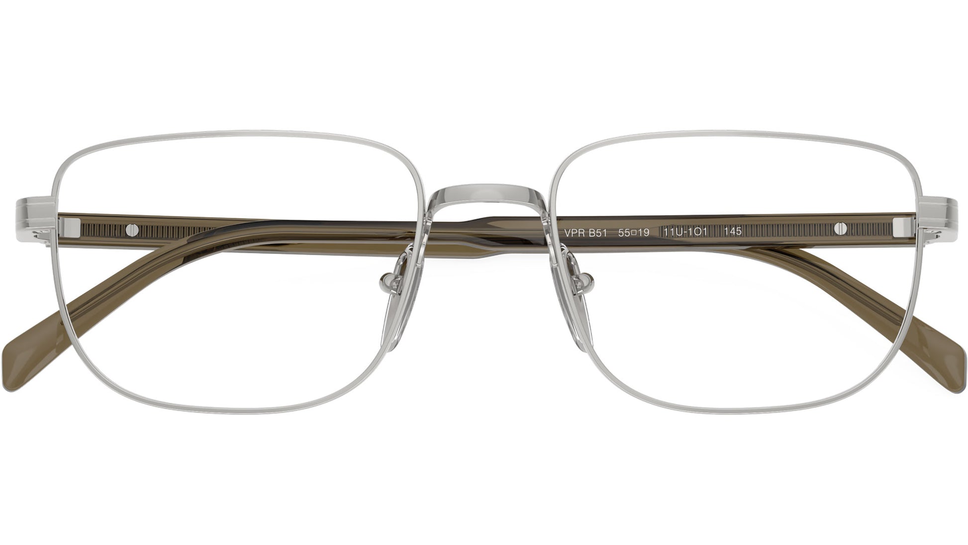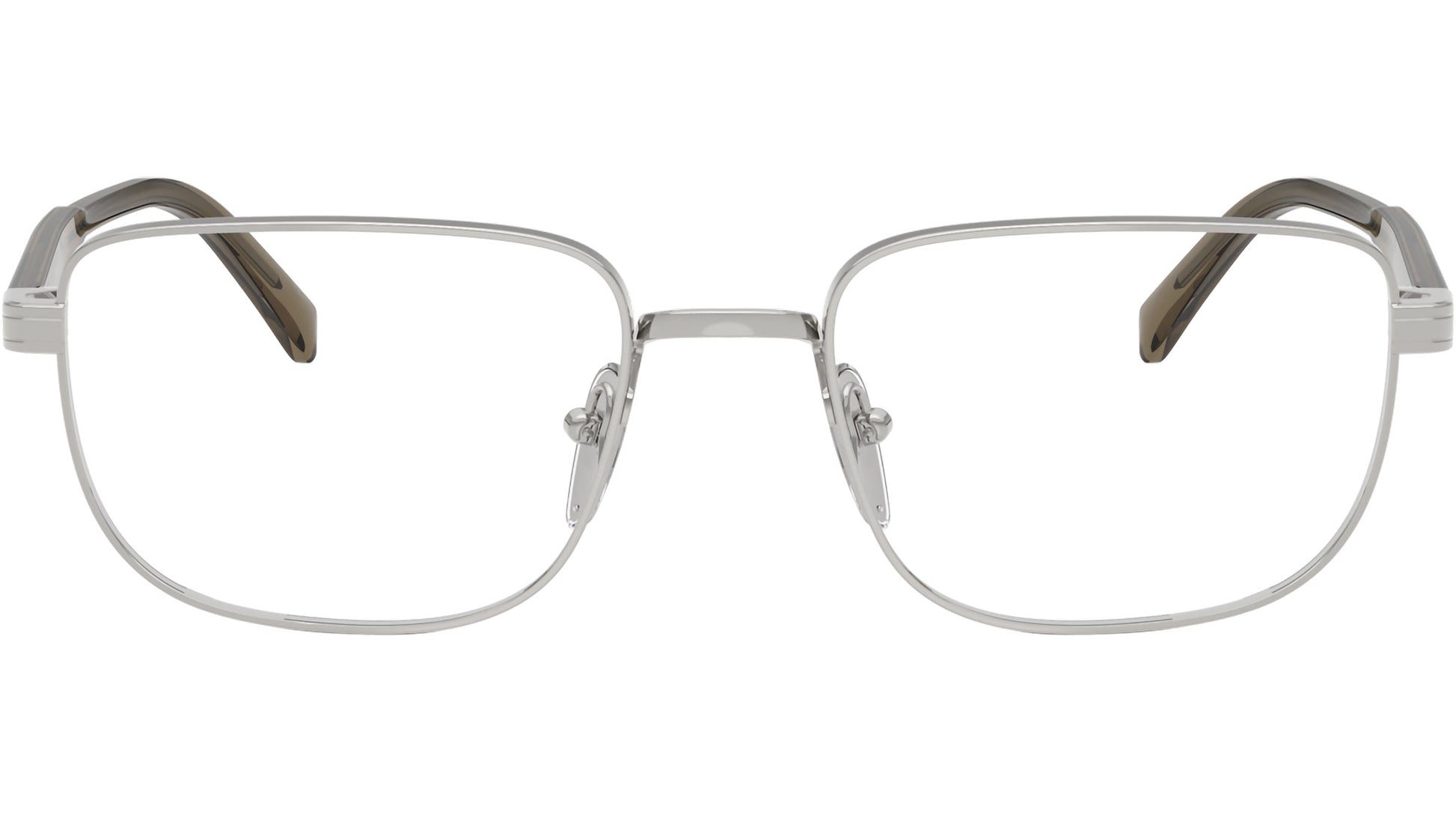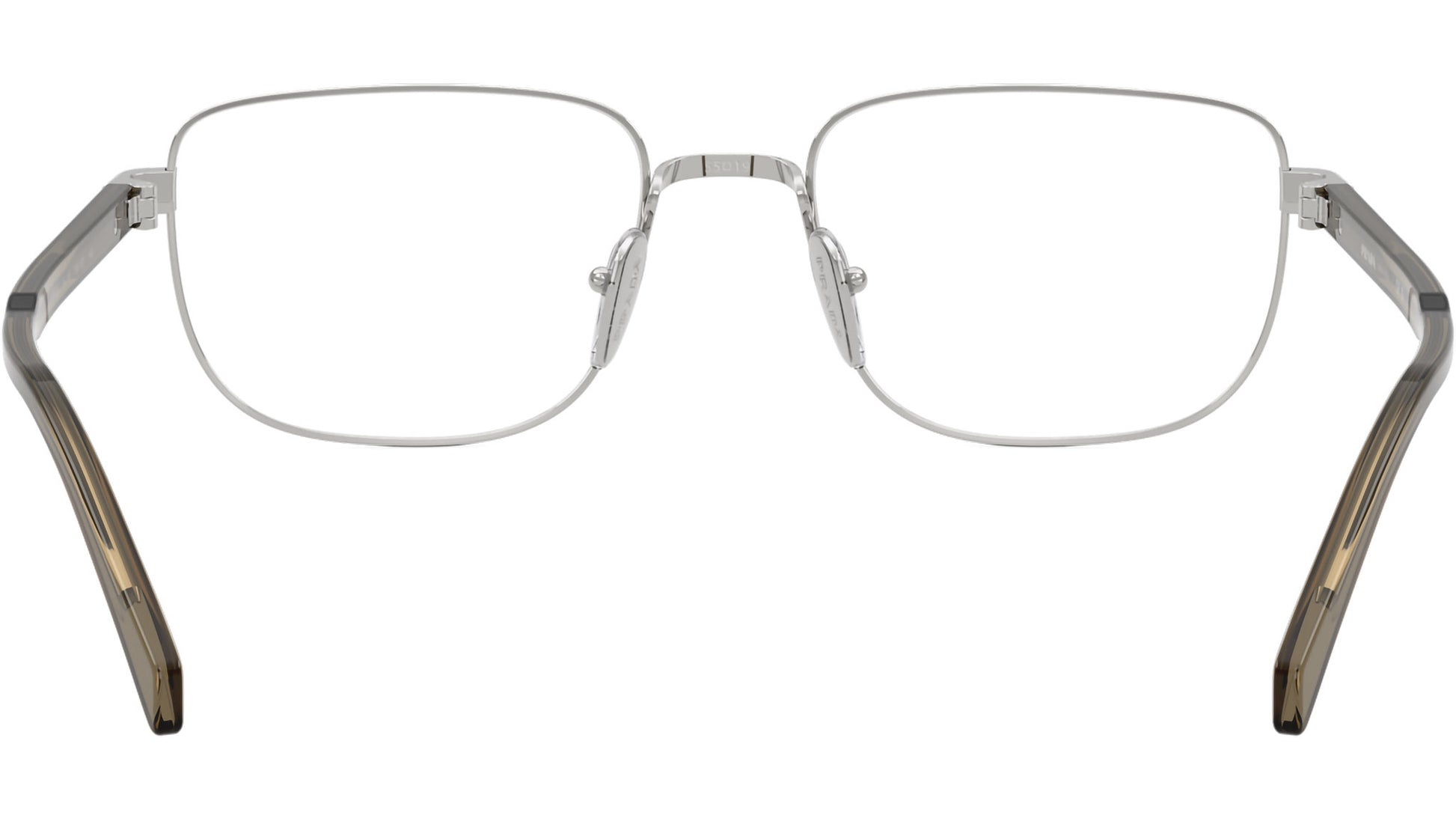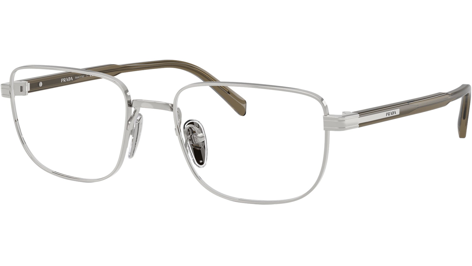 Prada PR B51V 11U1O1 glasses for men, featuring silver rectangular aluminum frame and demo lens . Adjustable nosepads. Brand line: Signature. Style code: PRB51V. Color code: 11U1O1. Made in Italy. Authorized Prada online reseller. Your glasses will include the original case and accessories and are covered by a 12-month global warranty.
