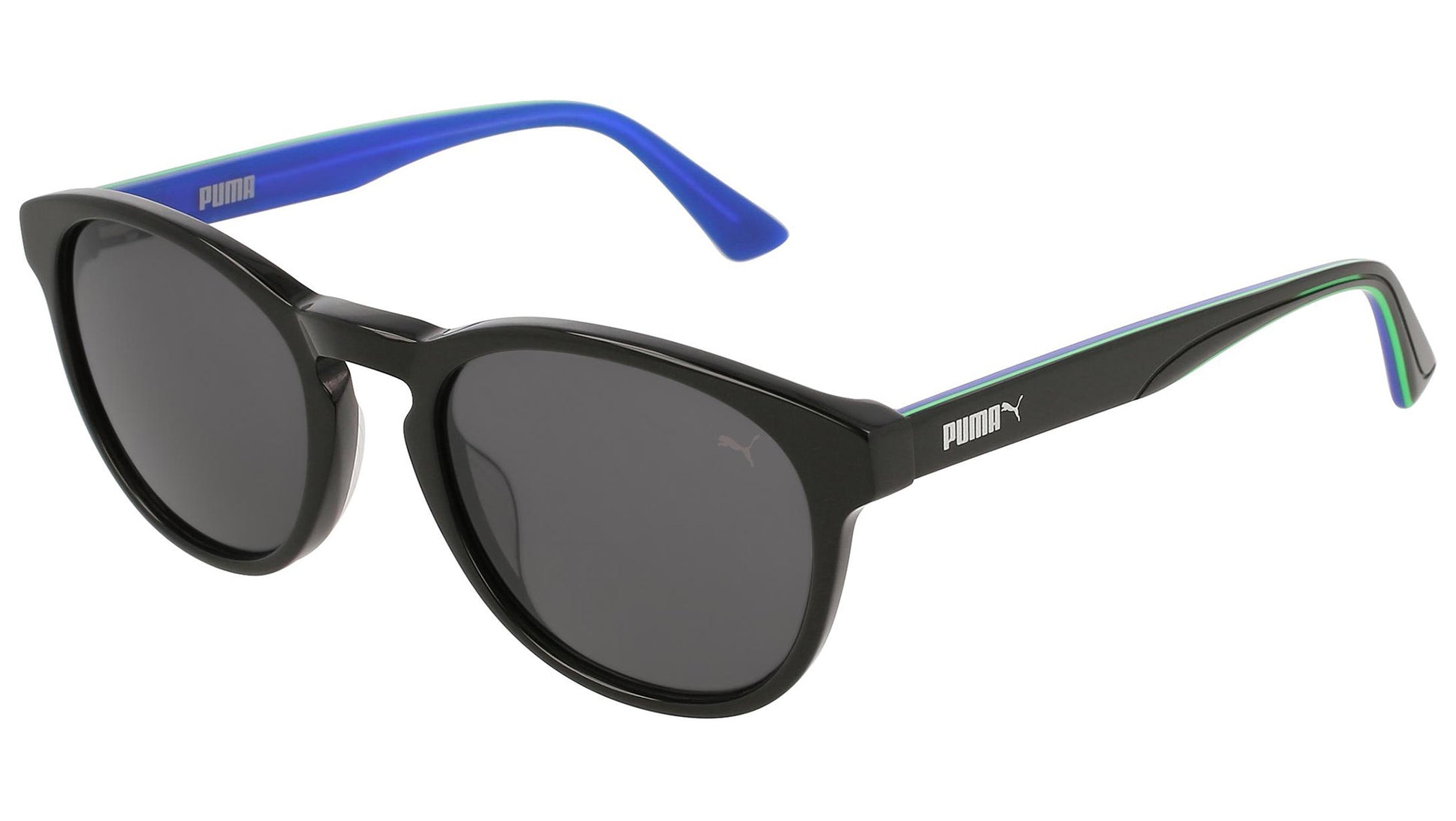 Puma for Kids model PJ0023S 005 shiny black sunglasses, with grey lenses. These kids are on the move. They roam the streets in search for recognition, emotions and daily kicks: celebrating with friends at the Luna Park, a thrilling jump, a trick on a skateboard, or simply seeing something new.