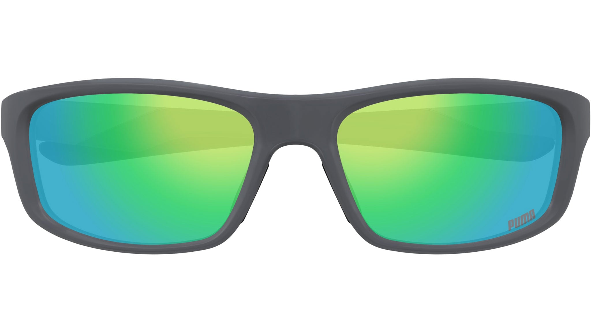 Puma PU0480S 003 sunglasses for men, featuring solid matte dark grey rectangular injection frame and solid smoke with mirror green polycarbonate lenses. Brand line: Sport. Style code: PU0480S. Color code: 003. Authorized Puma Eyewear online reseller. Your glasses will include the original case and accessories and are covered by a 12-month global warranty.