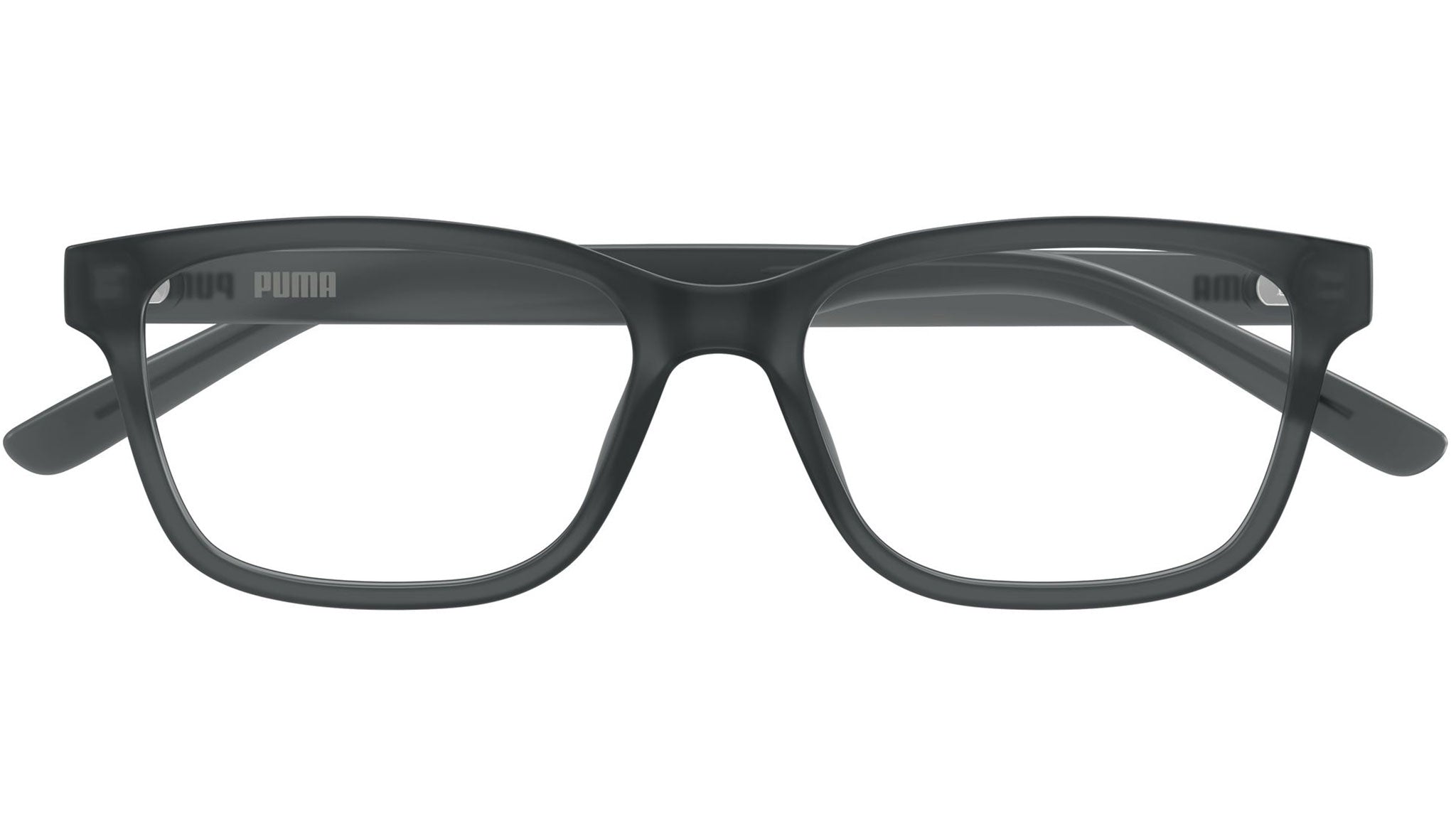 Puma PU0529O 002 glasses for men, featuring matte transparent grey rectangular injection frame and demo lenses. Brand line: Essential. Style code: PU0529O. Color code: 002. Authorized Puma Eyewear online reseller. Your glasses will include the original case and accessories and are covered by a 12-month global warranty.