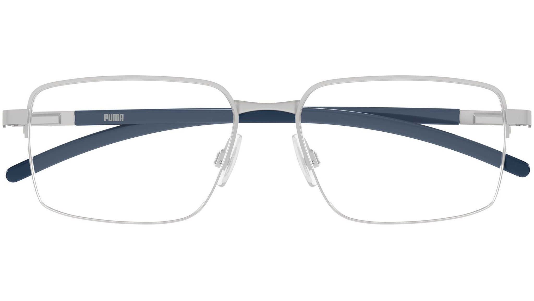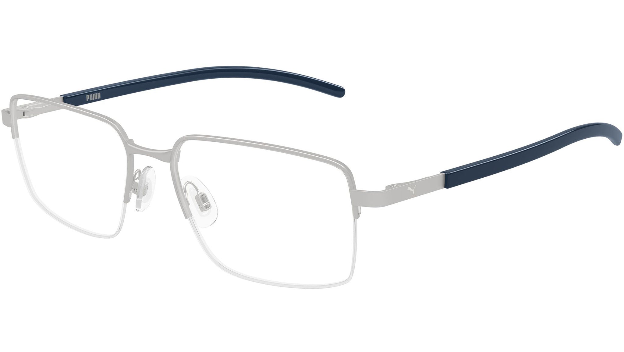 Puma PU0538O 009 glasses for men, featuring matte light ruthenium rectangular metal frame and demo lenses. Brand line: Tech. Style code: PU0538O. Color code: 009. Authorized Puma Eyewear online reseller. Your glasses will include the original case and accessories and are covered by a 12-month global warranty.
