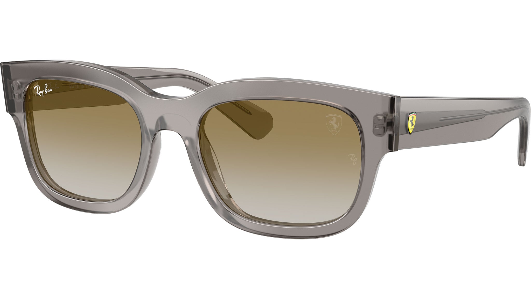 Ray-Ban RB2228M F7046E sunglasses for men and woman, featuring transparent grey squared acetate frame and brown mirror gold bio polyamide lenses. Brand line: Ferrari. Style code: 0RB2228M. Color code: F7046E. Authorized Ray-Ban online reseller. Your glasses will include the original case and accessories and are covered by a 12-month global warranty.