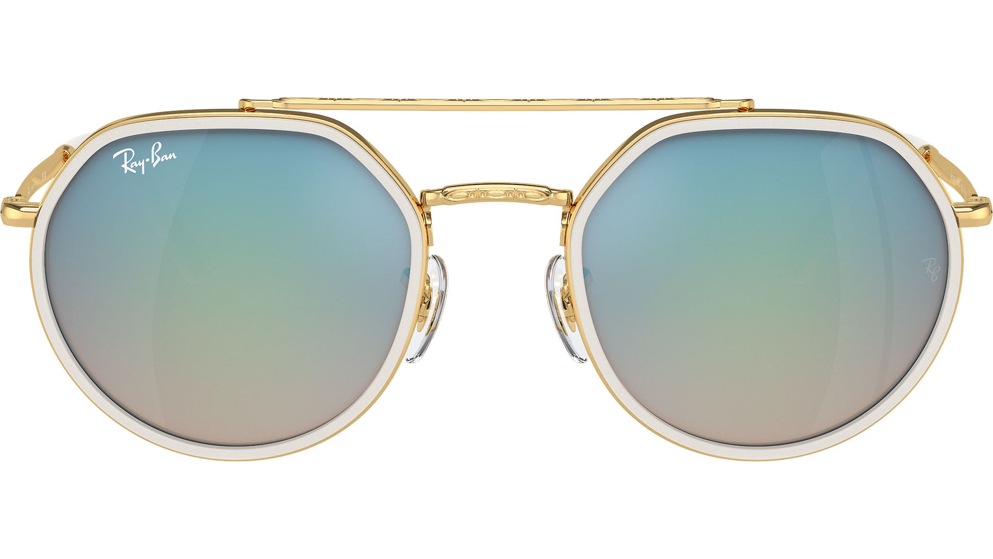 Ray-Ban geometric sungasses model RB3765 from Ray-Ban Evolution eyewear line, color code 001/4O gold metal frame with blue lens.