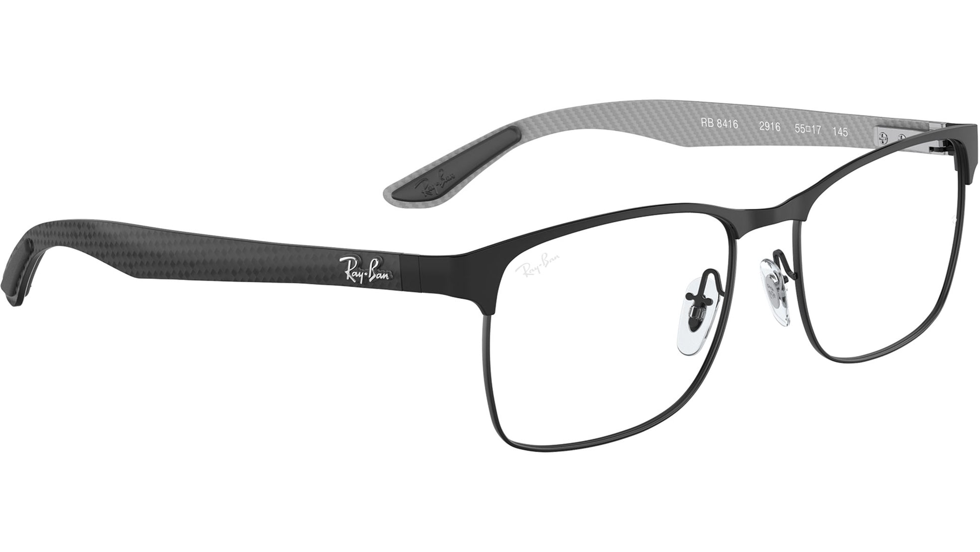 Ray-Ban RB8416 Optics RB8416 2916 glasses for men and woman, featuring matte black on gunmetal squared metal frame and demo lens. Adjustable nosepads. Brand line: Performance. Style code: 0RX8416. Color code: 2916. Authorized Ray-Ban online reseller. Your glasses will include the original case and accessories and are covered by a 12-month global warranty.