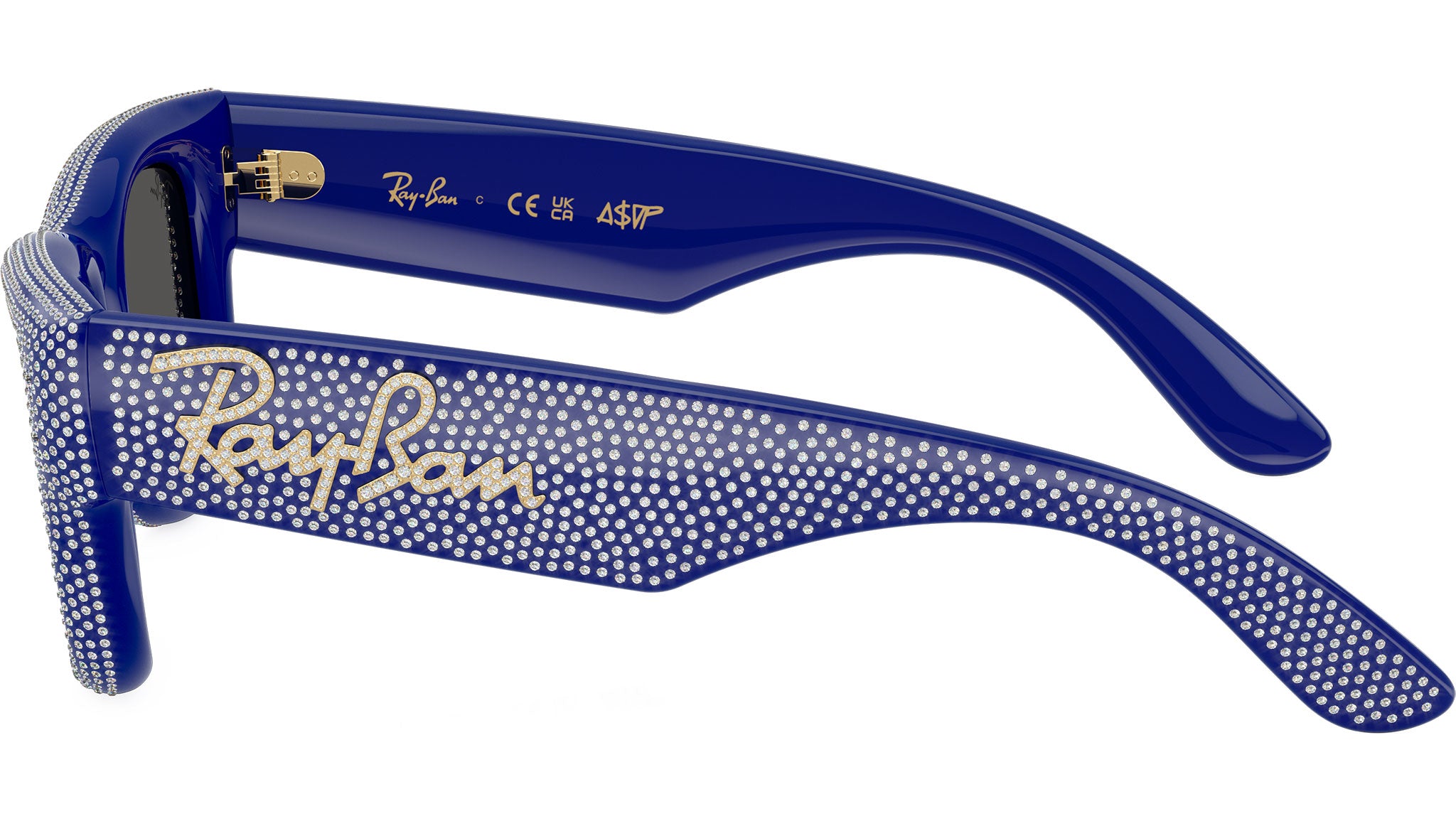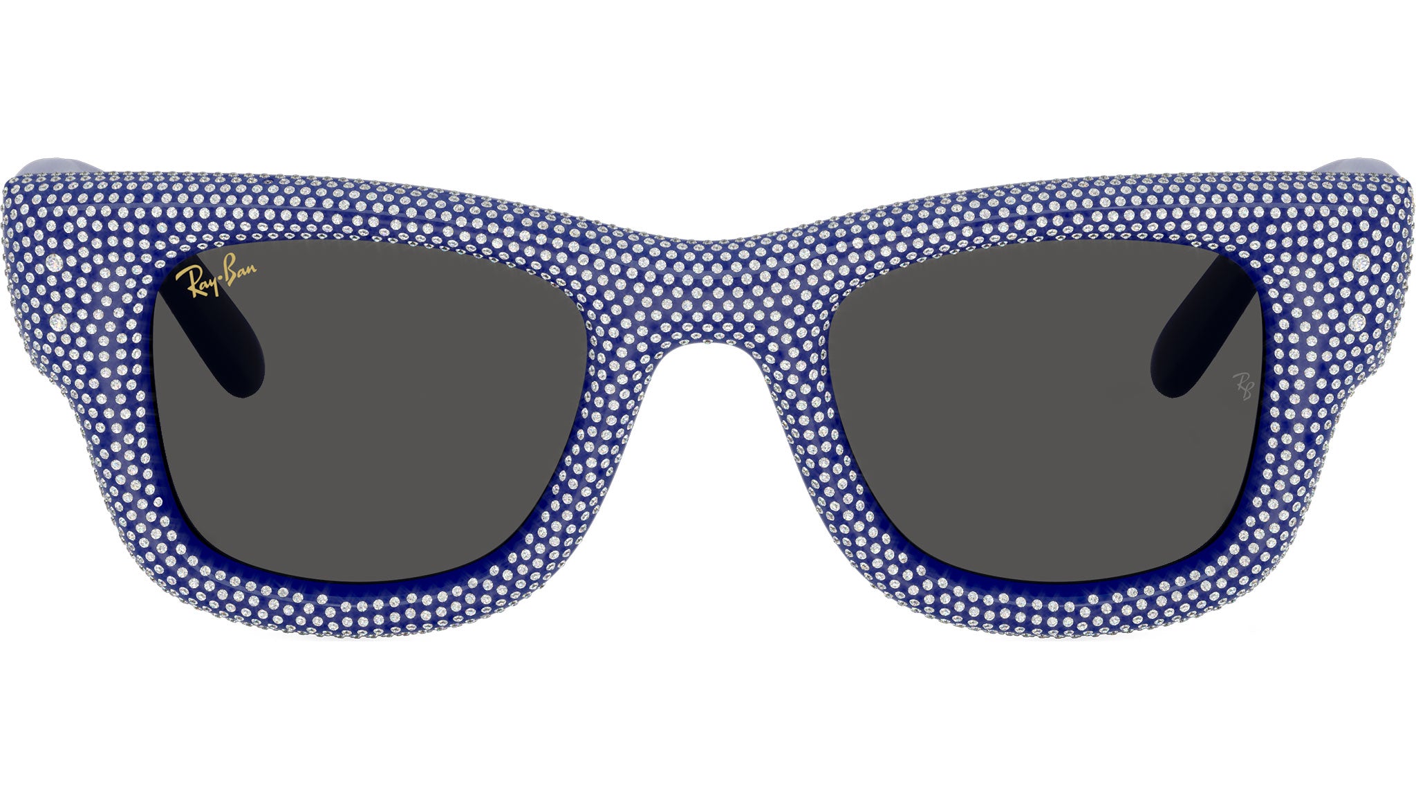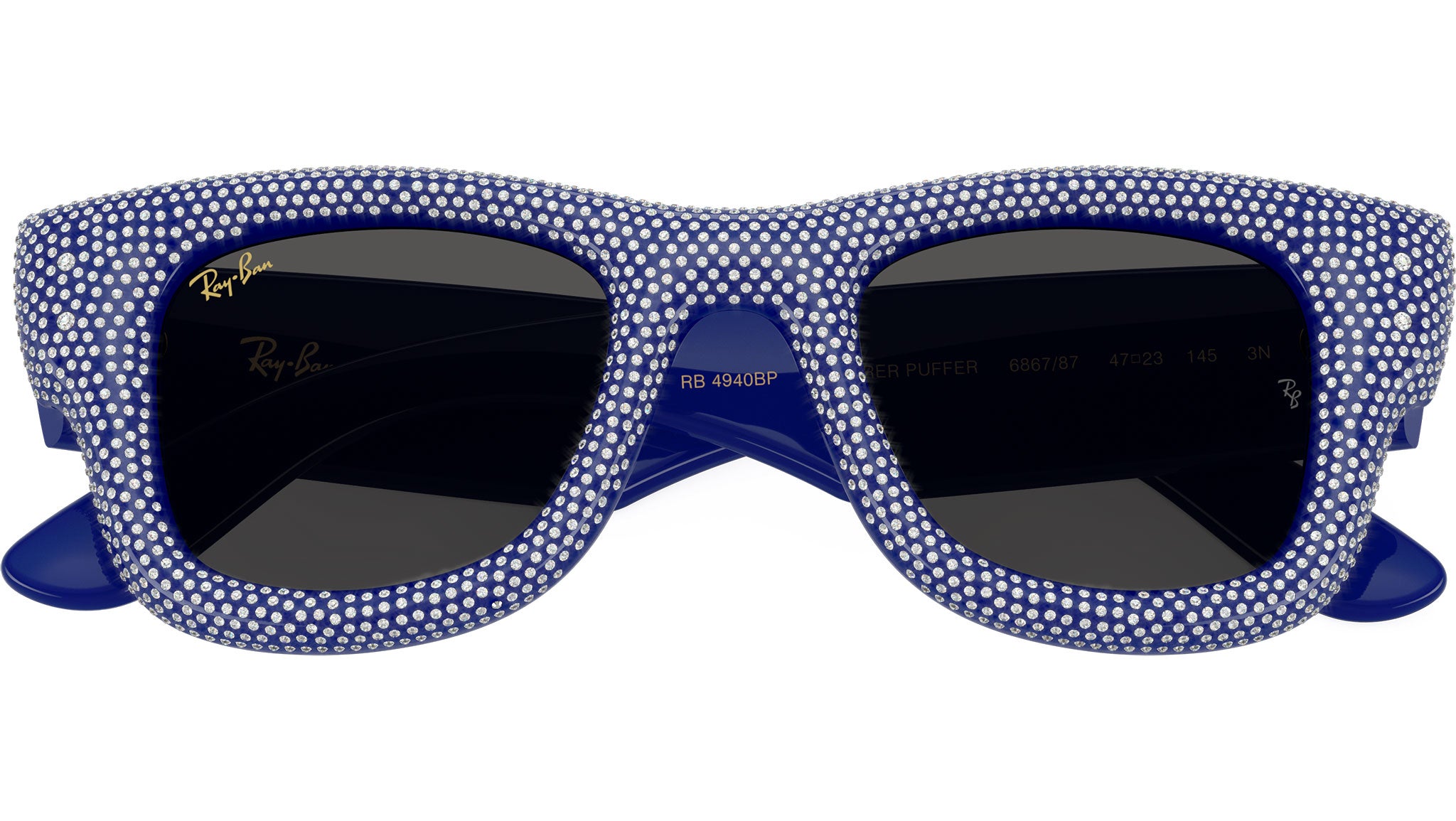 Ray-Ban Wayfarer Puffer RB4940BP 686787 sunglasses for men and woman, featuring blue & strass pave squared nylon frame and dark grey bio polyamide lenses. Designed under the artistic direction of A$AP Rocky, the Wayfarer Puffer from the Blacked Out collection transforms a Ray-Ban classic into a statement piece of wearable luxury. This avant-garde edition is fully adorned with pavé strass, including the Ray-Ban logo on both temples, creating a bold, sparkling aesthetic. The squared blue nylon frame emphasizes volume and geometric presence, while sculpted temples and signature metal rivets reinforce its distinctive identity. Paired with dark grey bio polyamide lenses, the model delivers clarity, contrast, and a modern edge, merging streetwear attitude with high-fashion appeal. High bridge fit. Brand line: Evolution. Style code: 0RB4940BP. Color code: 686787. Authorized Ray-Ban online reseller. Your glasses will include the original case and accessories and are covered by a 12-month global warranty.