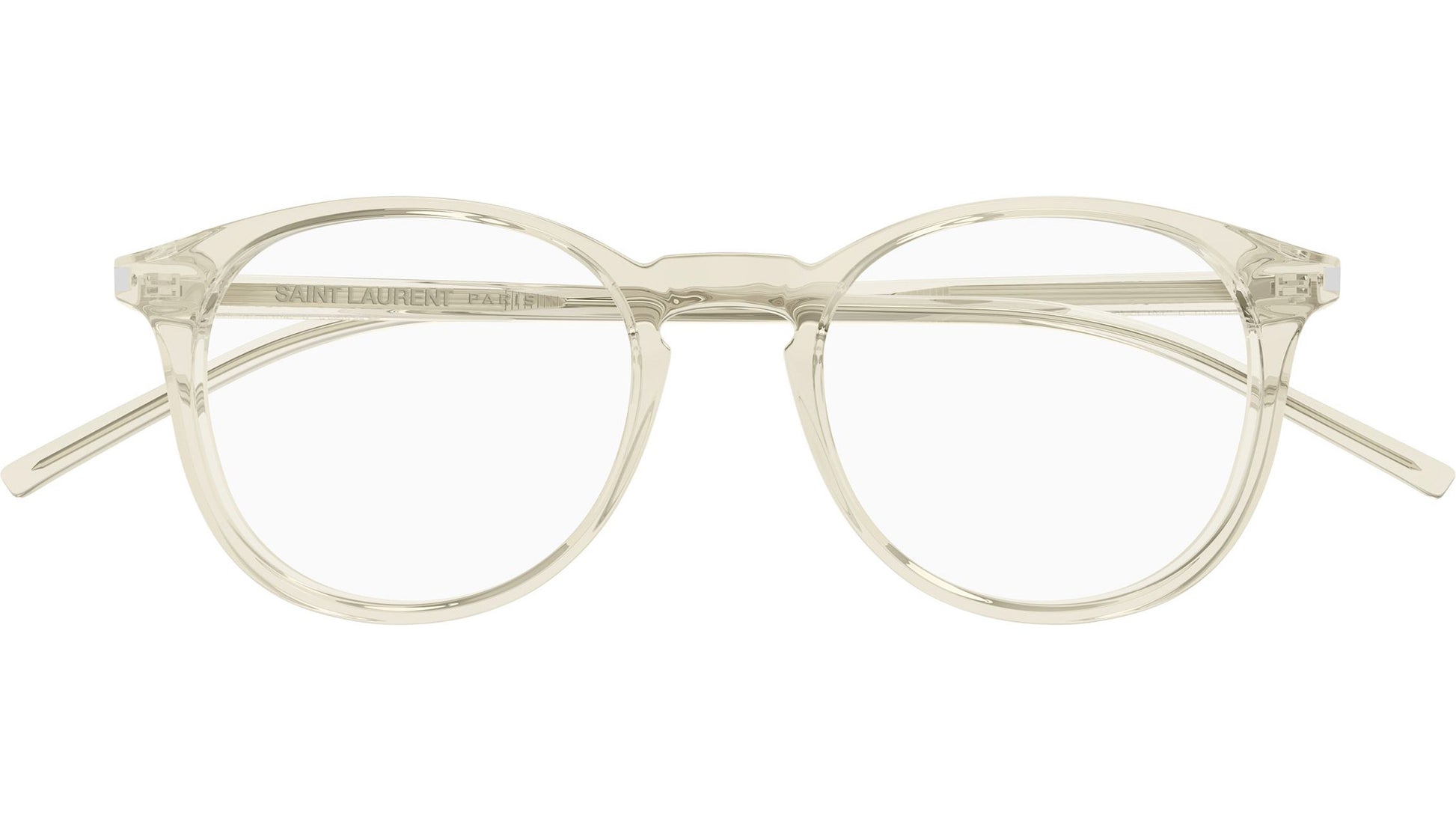 Saint Laurent SL 106 026 glasses for men and woman, featuring shiny transparent light yellow oval recycled acetate frame and demo lenses. Brand line: Corner Angle. Style code: SL 106. Color code: 026. Made in Italy. Authorized Saint Laurent online reseller. Your glasses will include the original case and accessories and are covered by a 12-month global warranty.