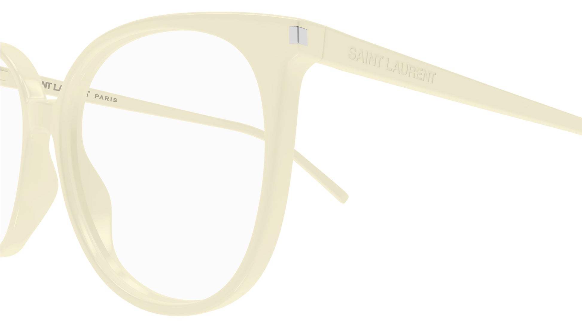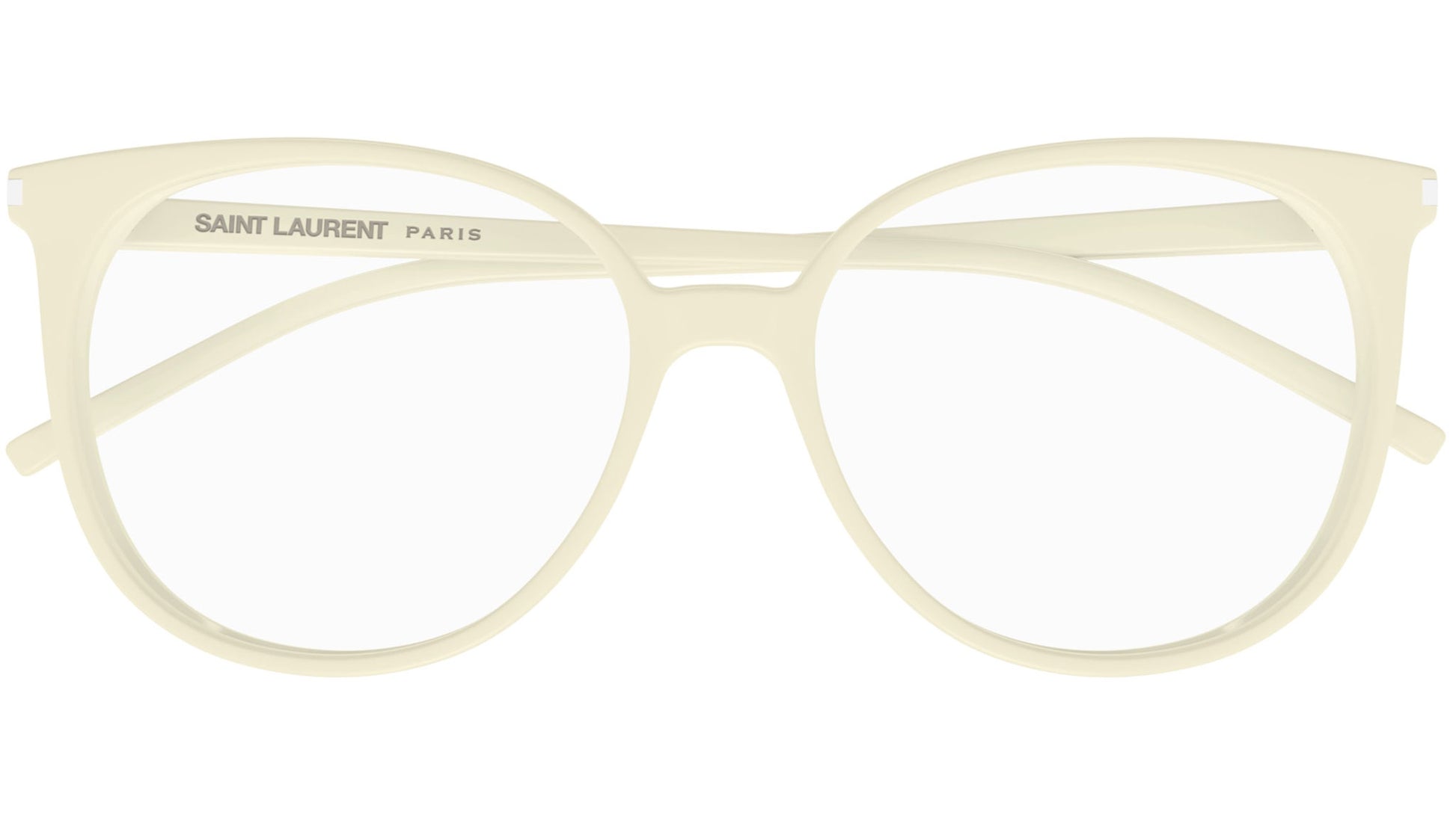 Saint Laurent SL 39 008 glasses for women, featuring shiny solid ivory panthos acetate frame and demo lenses. Brand line: Classic. Style code: SL 39. Color code: 008. Made in Italy. Authorized Saint Laurent online reseller. Your glasses will include the original case and accessories and are covered by a 12-month global warranty.