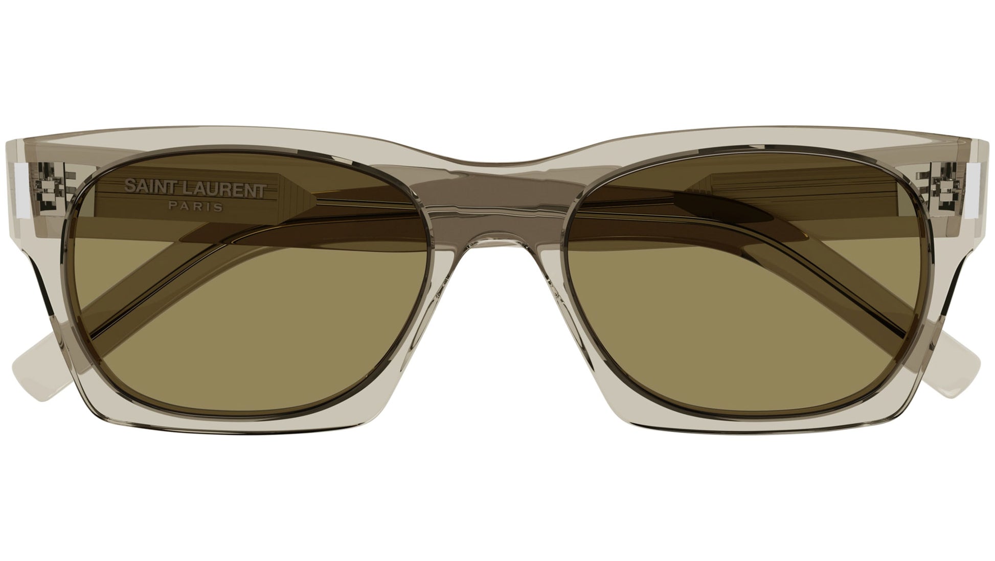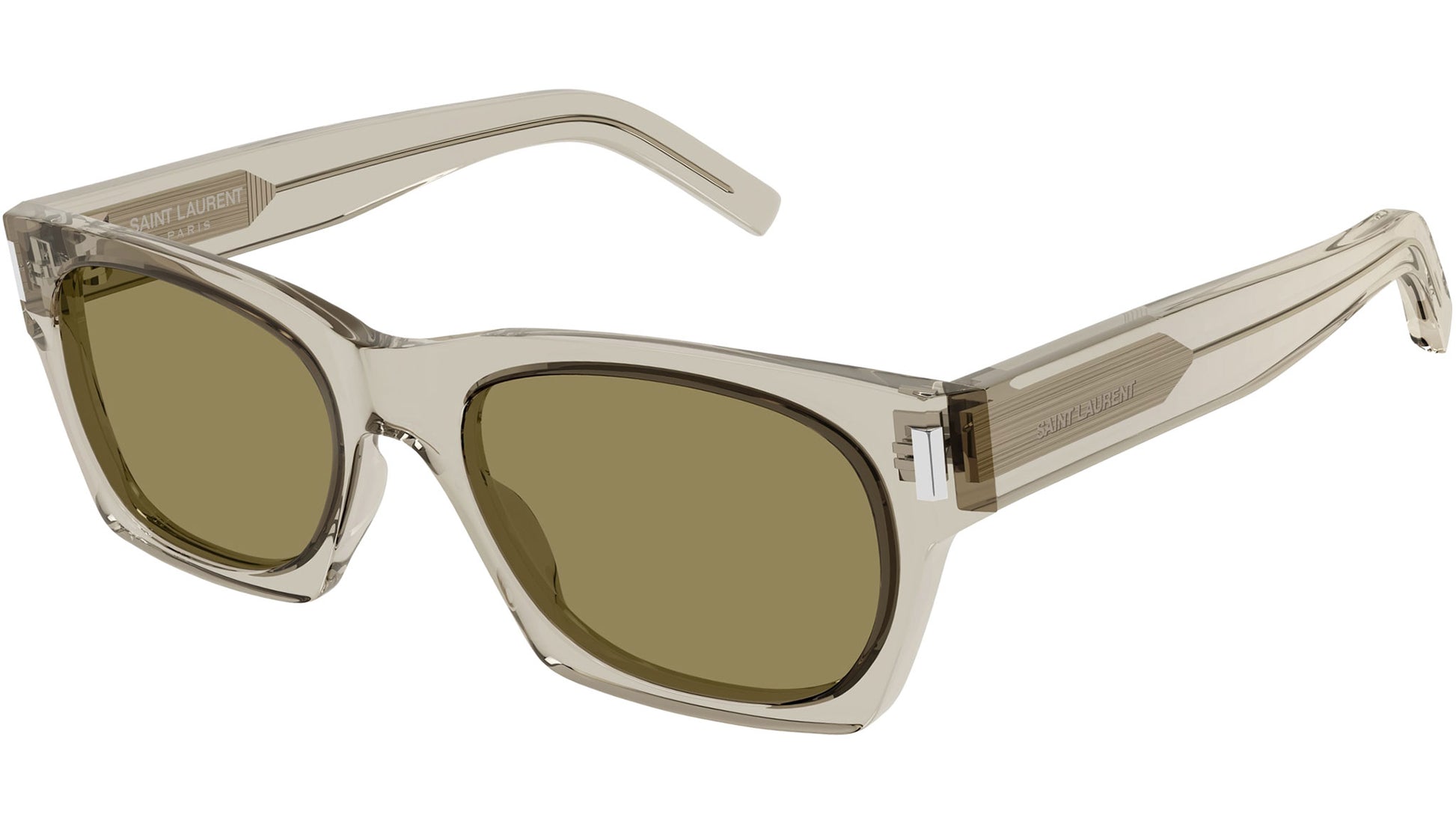 Saint Laurent SL 402 018 sunglasses for men and woman, featuring shiny transparent beige rectangular acetate frame and solid brown bio nylon lenses. Brand line: New Wave. Style code: SL 402. Color code: 018. Made in Italy. Authorized Saint Laurent online reseller. Your glasses will include the original case and accessories and are covered by a 12-month global warranty.
