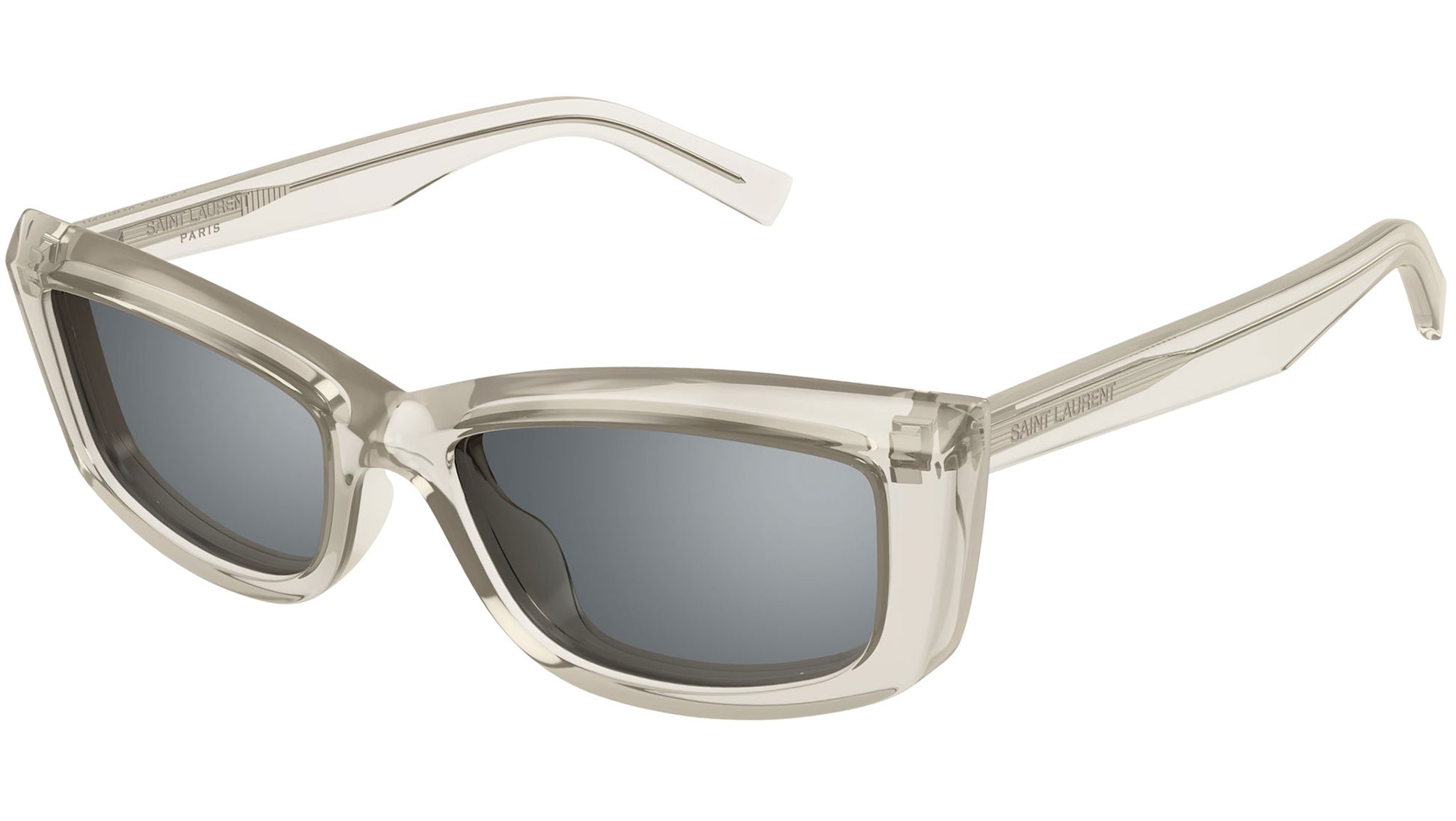 Saint Laurent SL 658 003 sunglasses for women, featuring shiny transparent cream cat eye recycled acetate frame and solid grey + mirror silver bio nylon lenses. Brand line: New Wave. Style code: SL 658. Color code: 003. Made in Italy. Authorized Saint Laurent online reseller. Your glasses will include the original case and accessories and are covered by a 12-month global warranty.