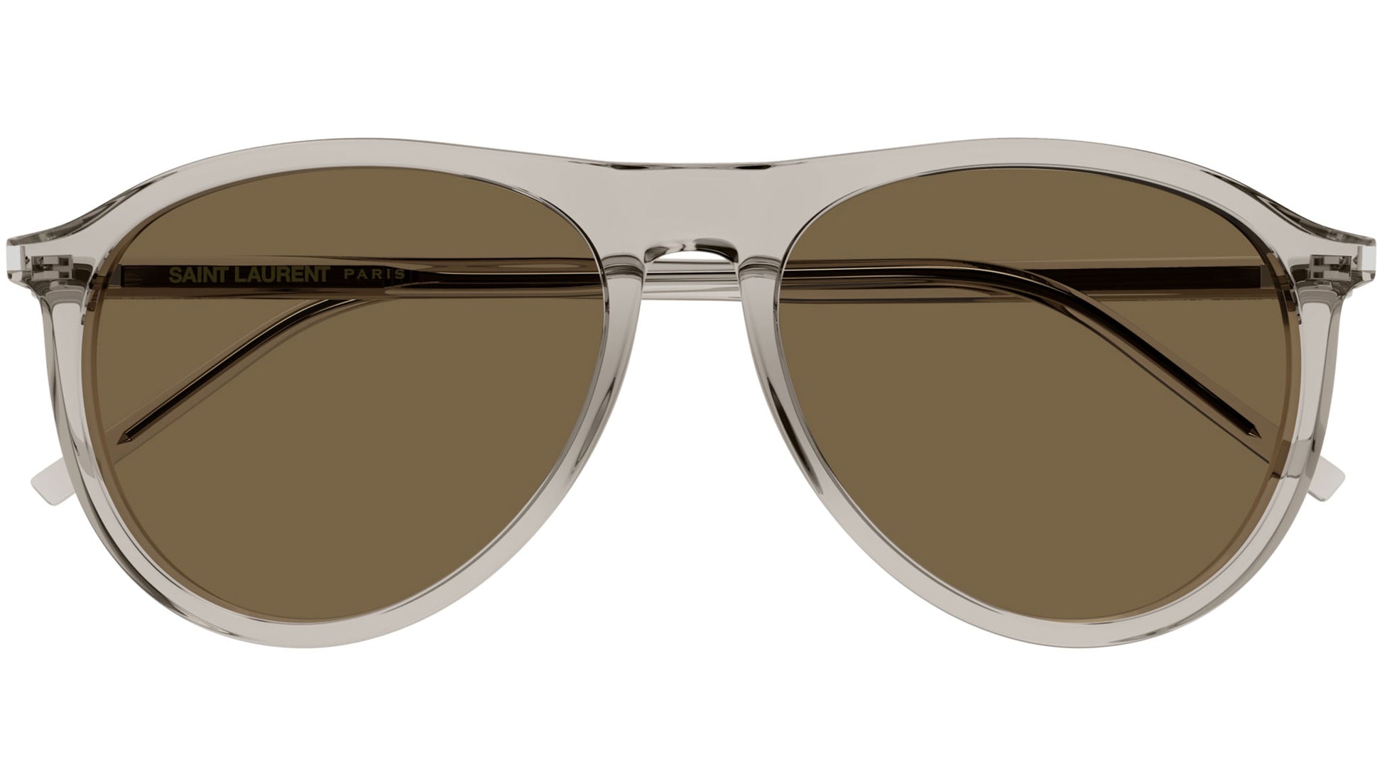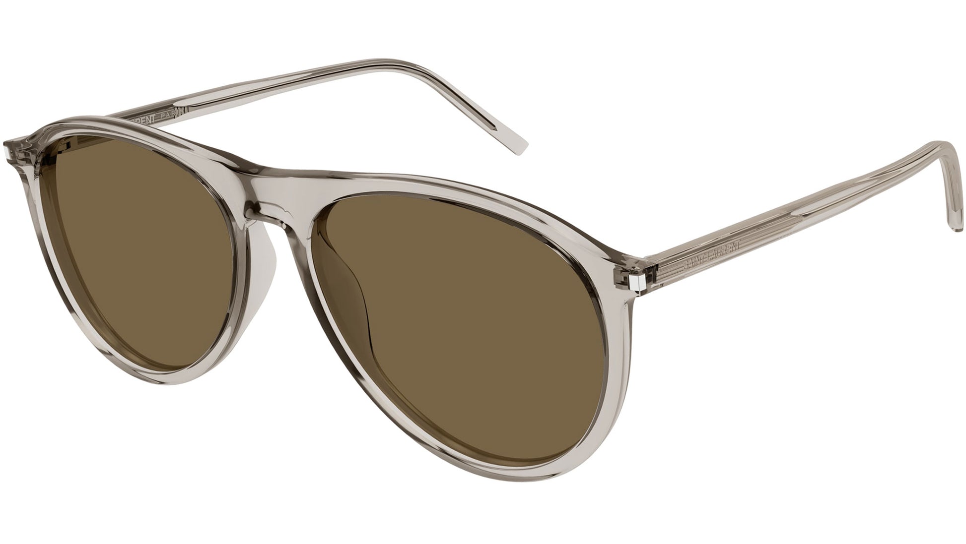 Saint Laurent SL 667 004 sunglasses for men and woman, featuring shiny transparent beige pilot recycled acetate frame and solid brown bio nylon lenses. Brand line: Classic. Style code: SL 667. Color code: 004. Made in Italy. Authorized Saint Laurent online reseller. Your glasses will include the original case and accessories and are covered by a 12-month global warranty.