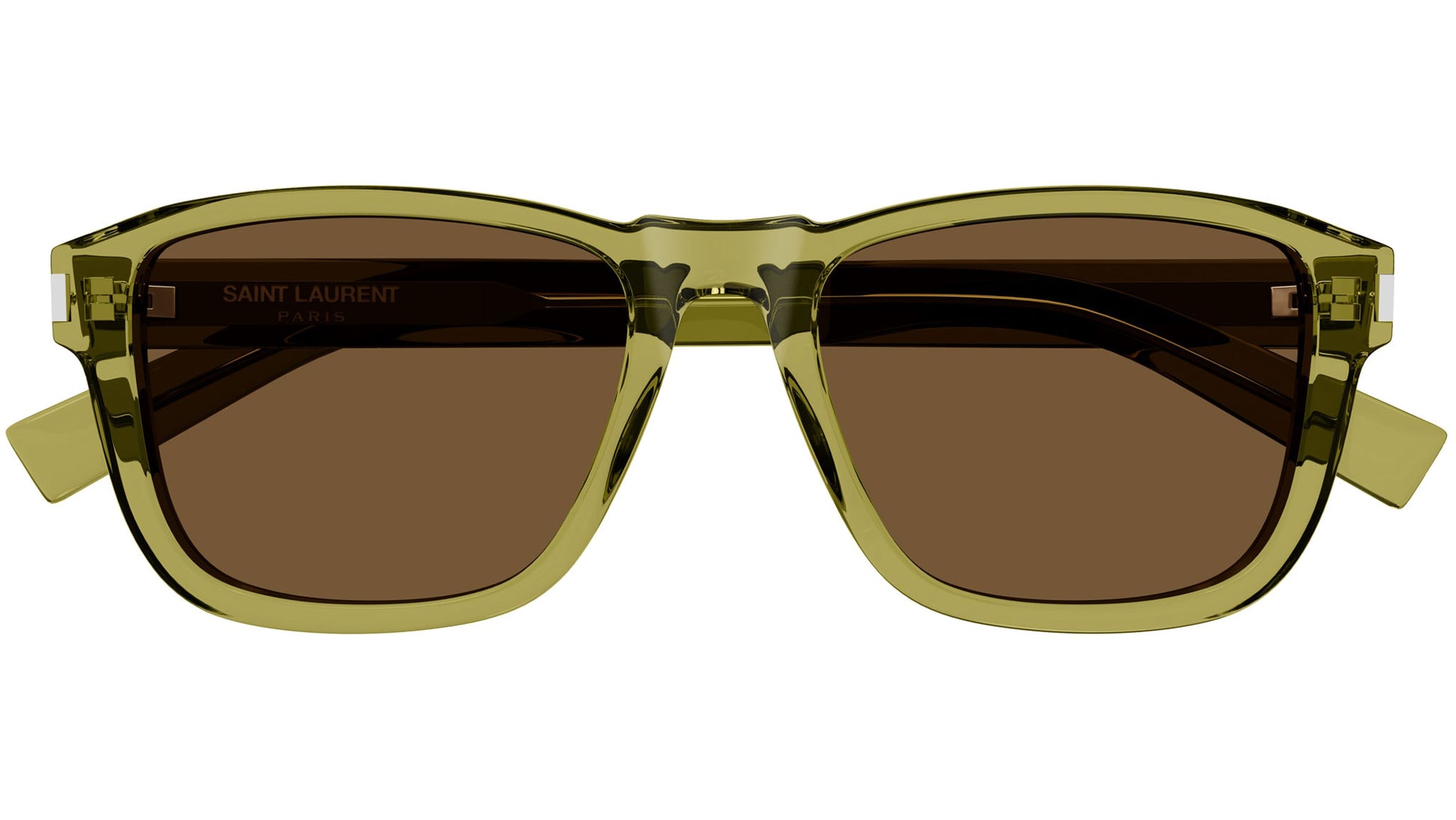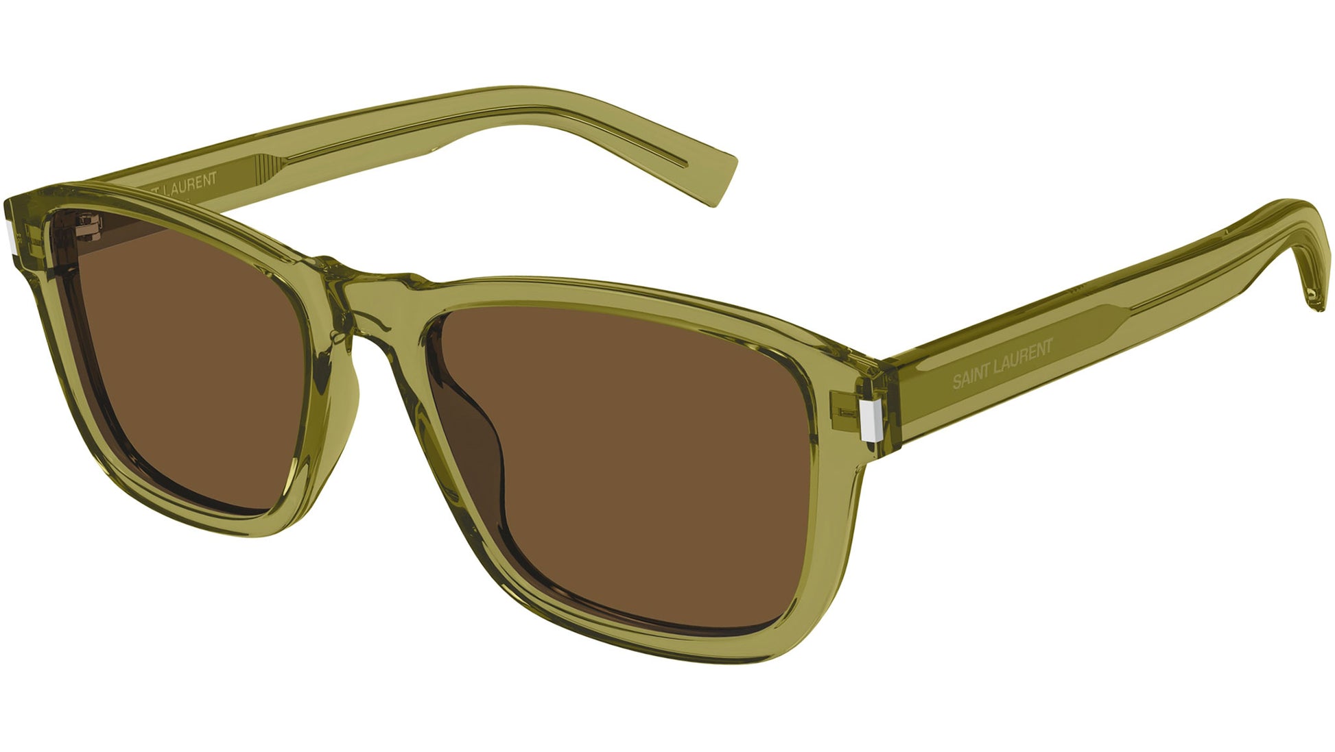 Saint Laurent SL 710 005 sunglasses for men, featuring shiny transparent acid green rectangular recycled acetate frame and solid brown bio nylon lenses. Brand line: Corner Angle. Style code: SL 710. Color code: 005. Made in Japan. Authorized Saint Laurent online reseller. Your glasses will include the original case and accessories and are covered by a 12-month global warranty.
