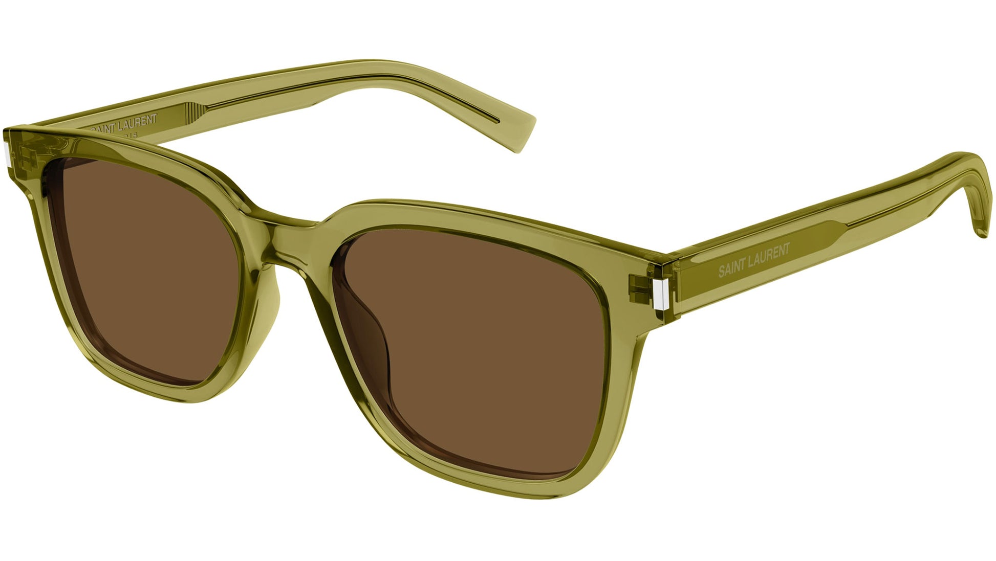 Saint Laurent SL 711 005 sunglasses for men, featuring shiny transparent acid green rectangular recycled acetate frame and solid brown bio nylon lenses. Brand line: Corner Angle. Style code: SL 711. Color code: 005. Made in Japan. Authorized Saint Laurent online reseller. Your glasses will include the original case and accessories and are covered by a 12-month global warranty.