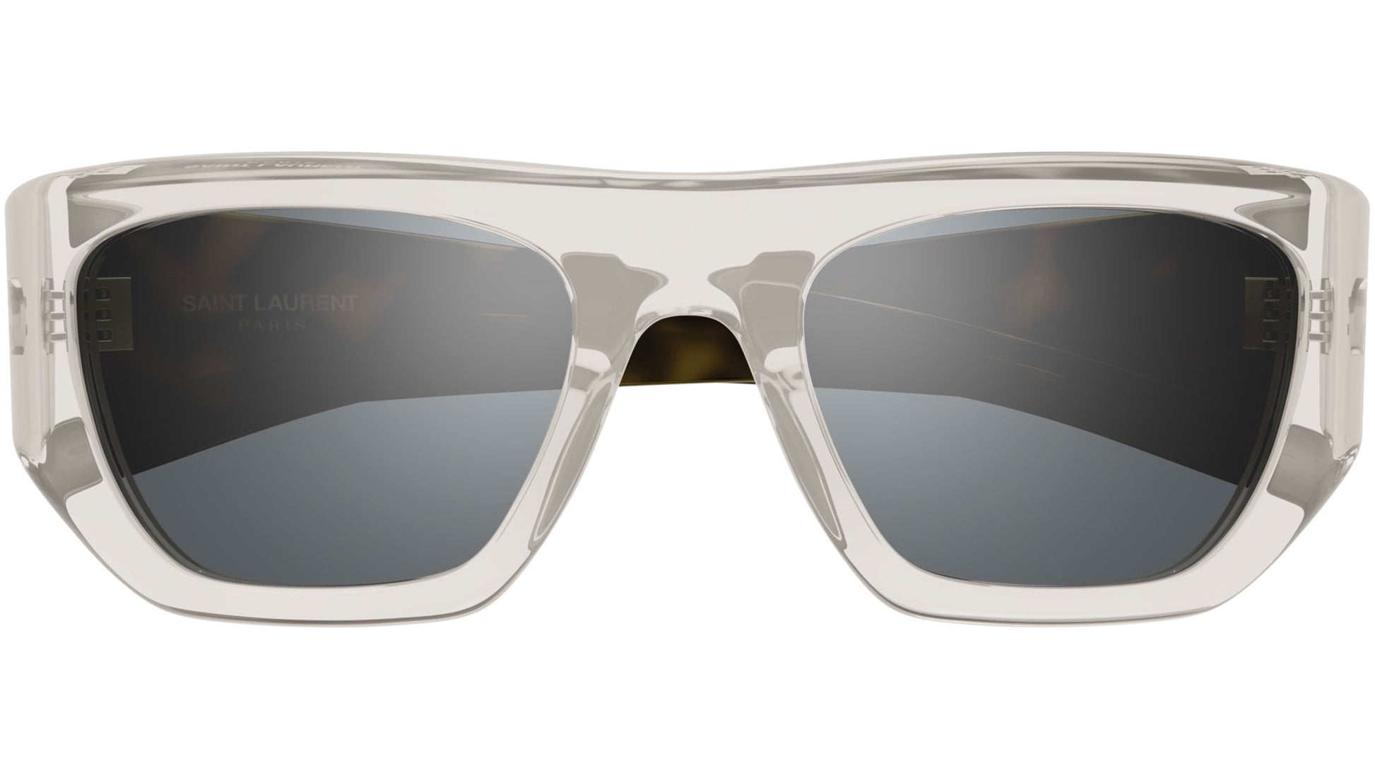 Saint Laurent SL 740 003 sunglasses for women, featuring shiny transparent cream rectangular recycled acetate frame and solid grey + mirror silver bio nylon lenses. Brand line: SL Logo. Style code: SL 740. Color code: 003. Made in Japan. Authorized Saint Laurent online reseller. Your glasses will include the original case and accessories and are covered by a 12-month global warranty.